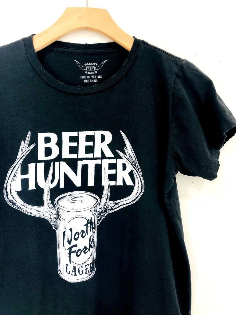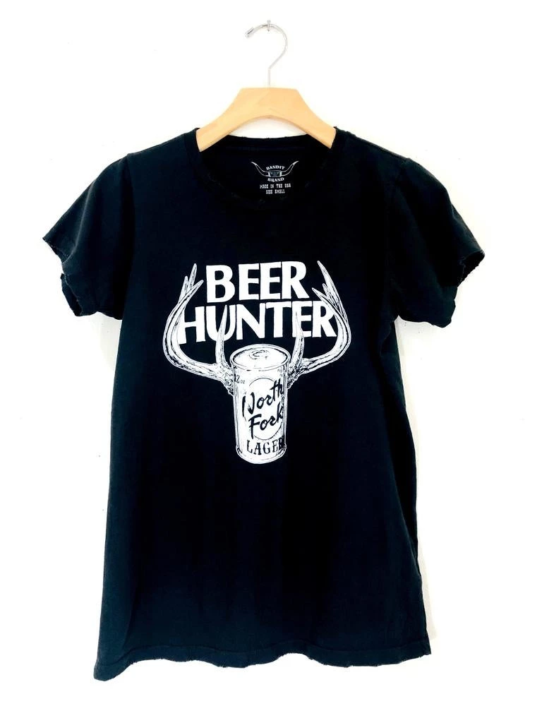 Our Beer Hunter tee is back and now in a classic fit! Raw edges and washed graphic make this tee an easy-to-rock piece.