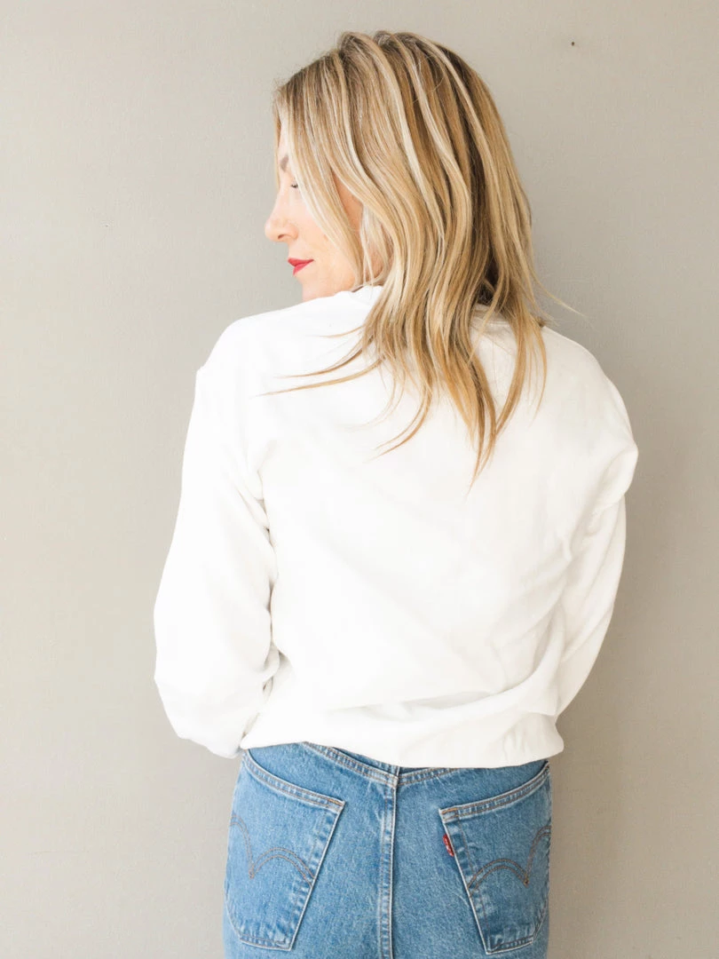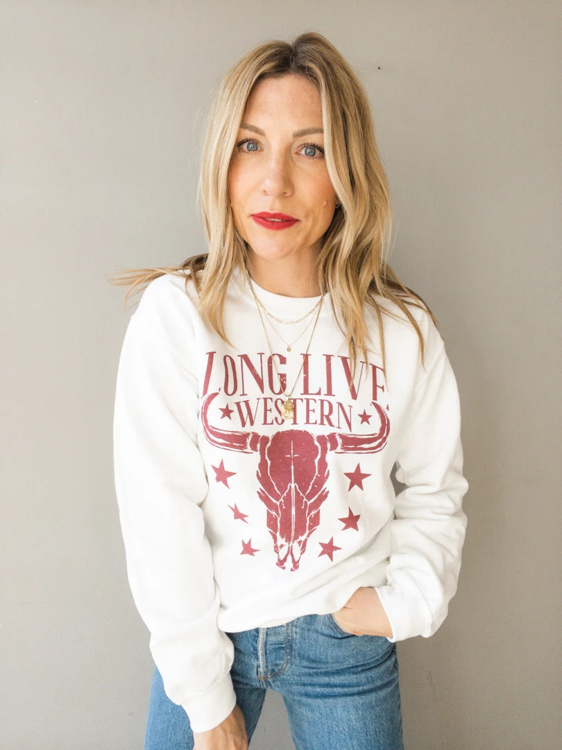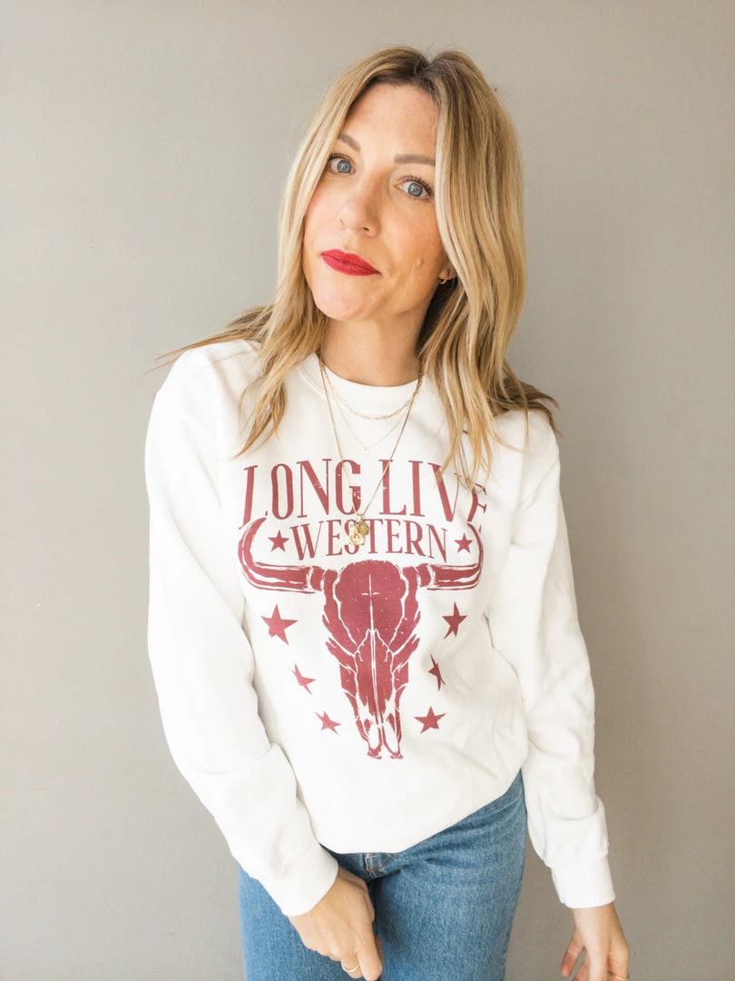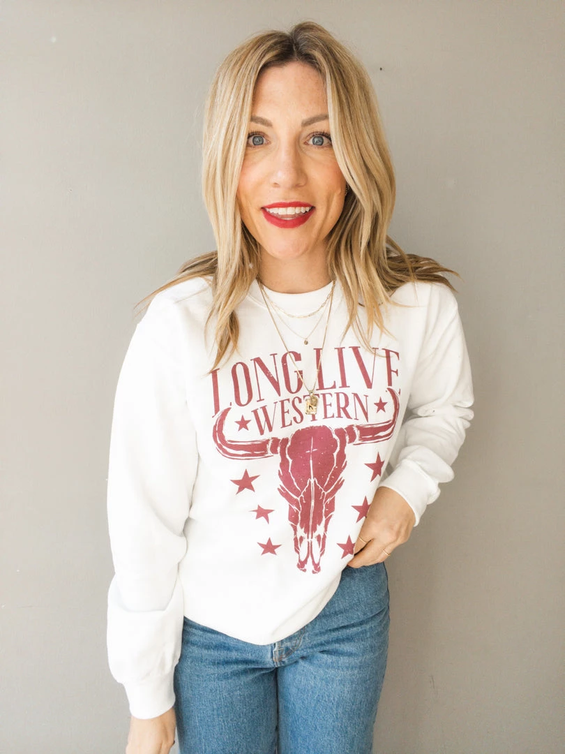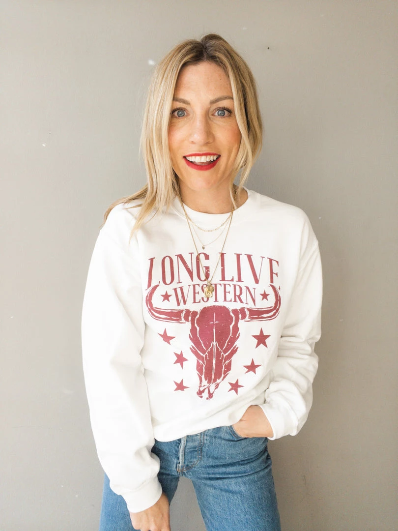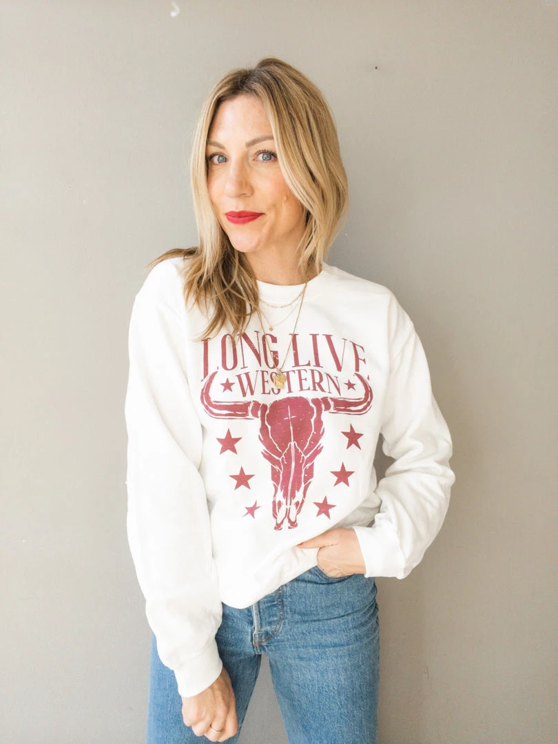 A white crew neck pullover sweatshirt with burgundy ‘long live western’ graphic. This nod to our love of country with the steer head image is an easy, everyday pullover. Pair with denim and sneakers for a laid back look we can never resist.