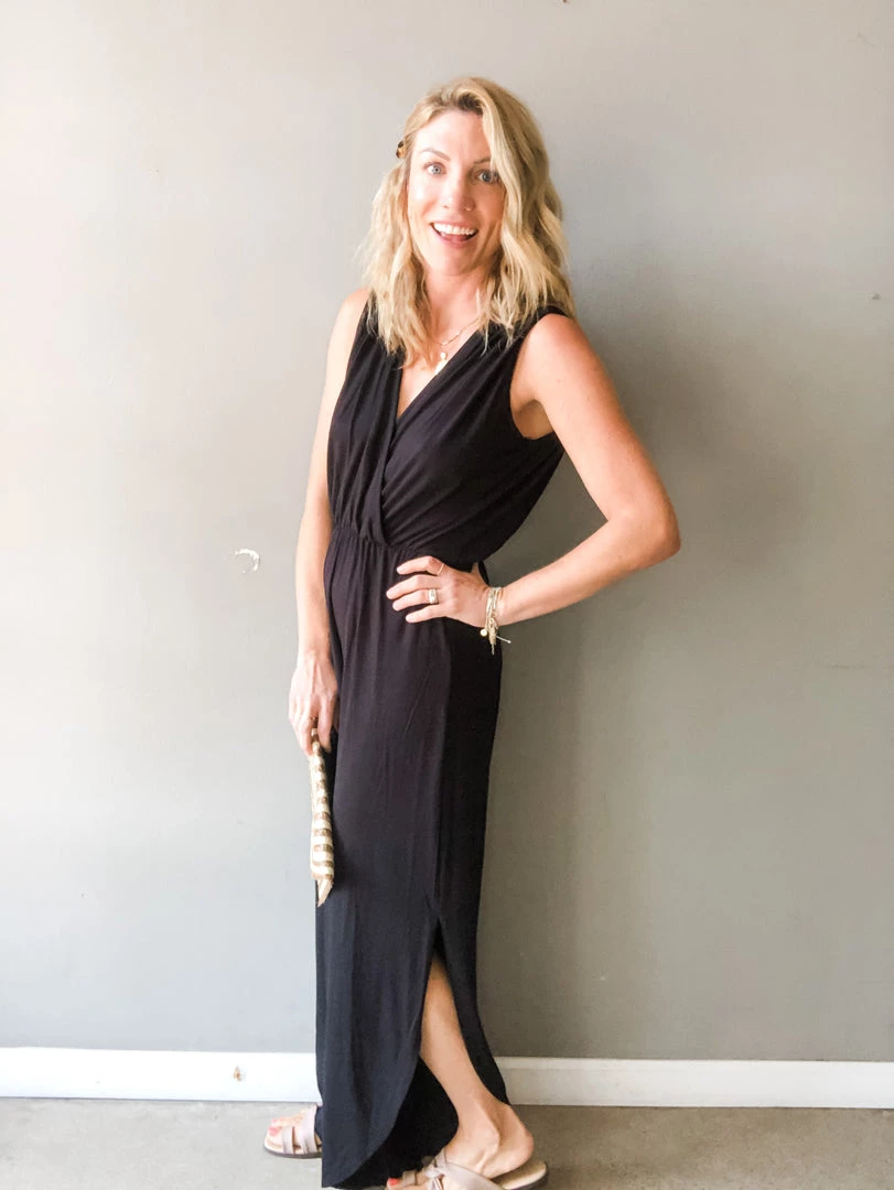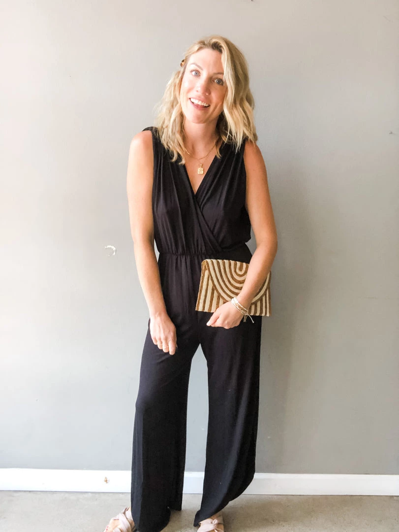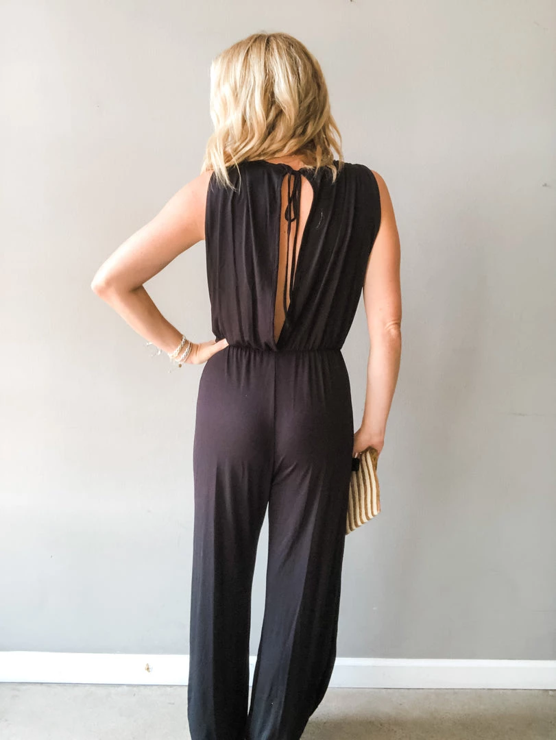Set the out of office and we are vacation bound in this lightweight side slit jumpsuit. Wide shoulder straps with cross over vneck, elastic waist, side slits and tie back closure with open back. Wear with any sandal or pair with a heel to dress her up. A great option for any occasion!