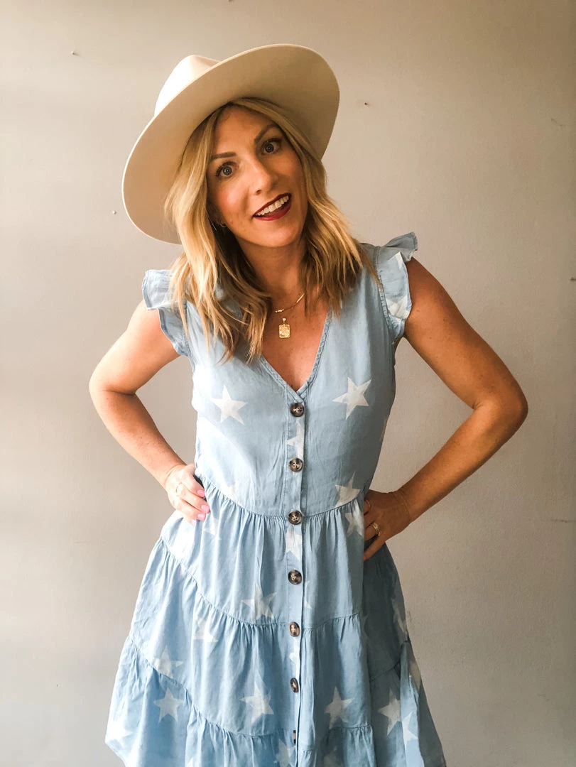 Shoot for the stars in this chambray button front dress. All over stars mini with a tiered skirt and flutter sleeve. Perfect for the 4th of July or any summer backyard bbq.