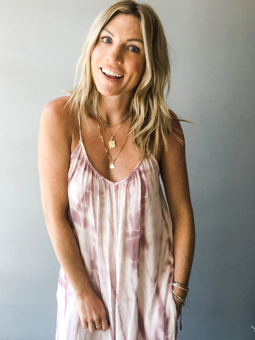 A loose fitting tie dye jumpsuit in a dusty mauve perfect for wherever your travels take you. Toss on for a dreamy beach vaca or for lounging at home on a hot summer day. This jumpsuit can also be dressed up for a dinner date. Adjustable spaghetti straps, deep v cut back and side pockets with long, wide legs has us loving the Daytripper Jumpsuit.