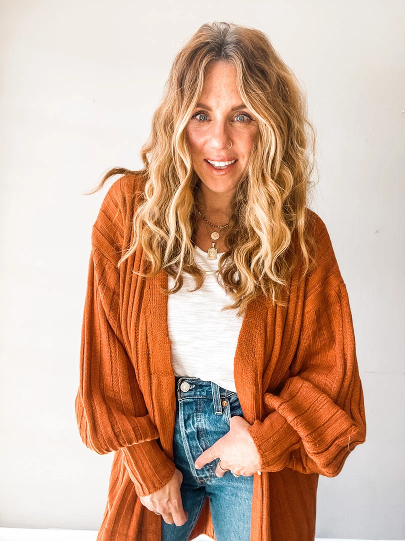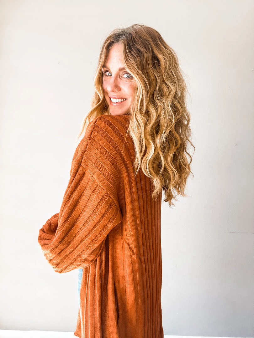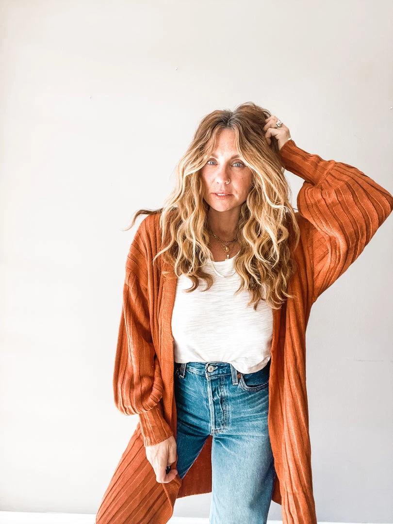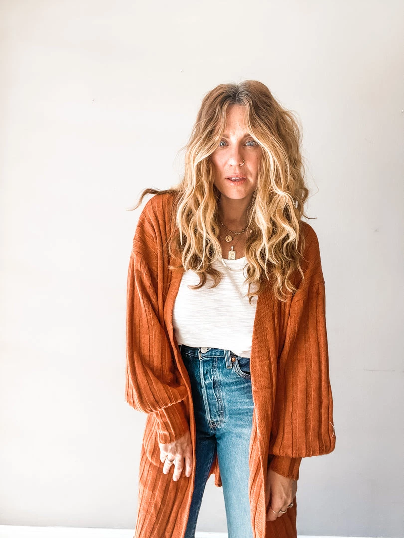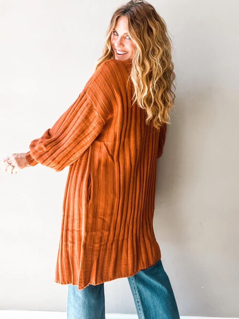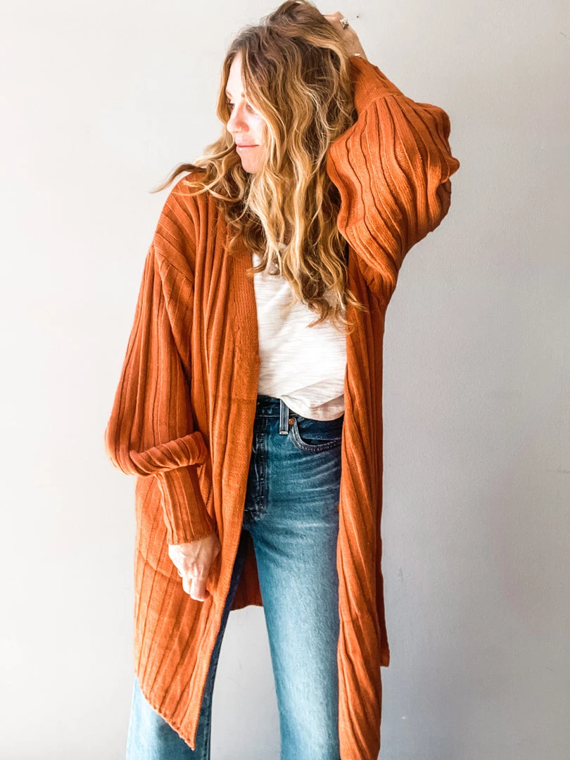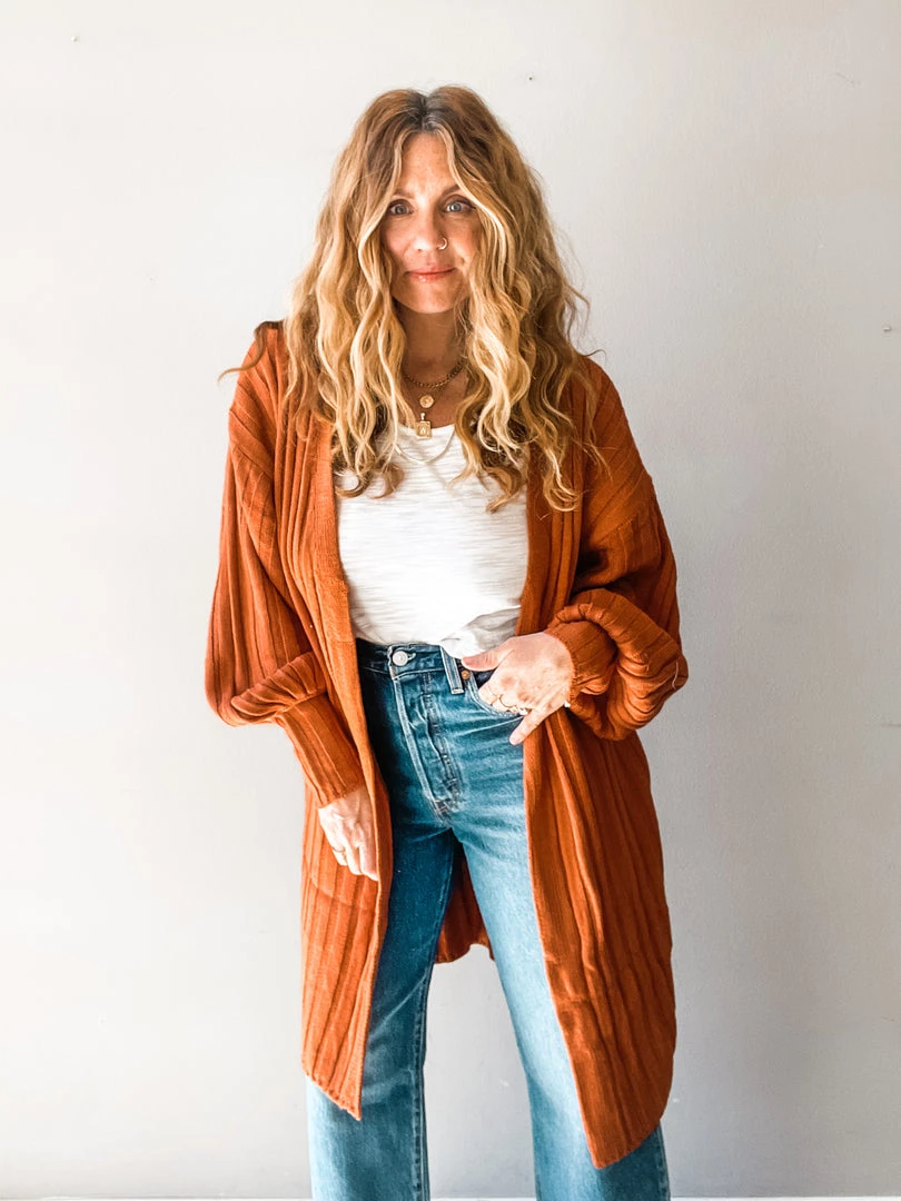 The Pumpkin Patch Cardi is a super cute, thicker ribbed long cardigan with deep side pockets!! We love this fun Fall colorway and fit for pairing with jeans, boots and your favorite tees and tanks!
