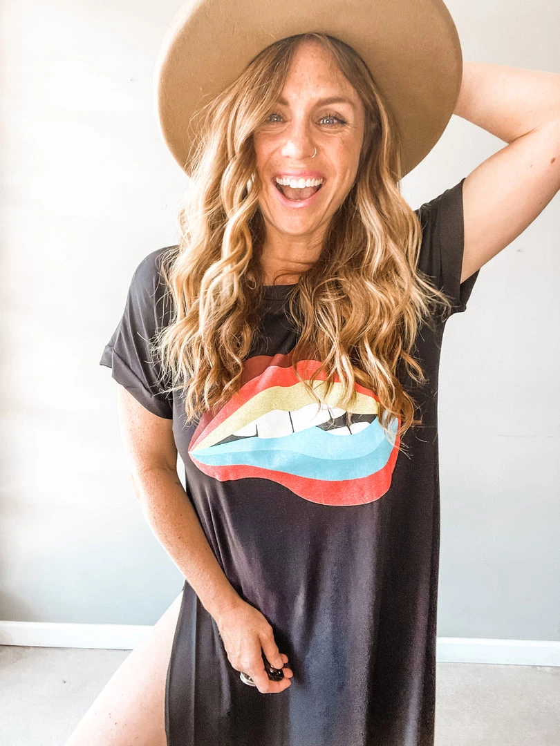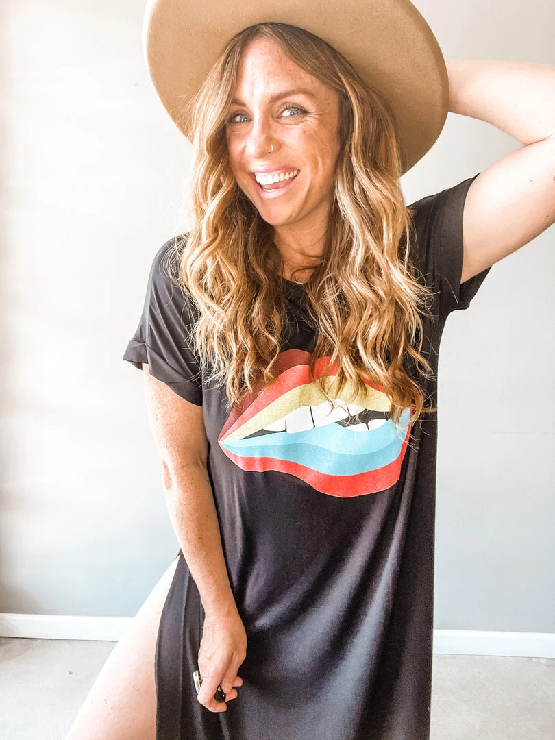 An easy fitting graphic tunic we love to toss on!! This short sleeved number has a loose fit, rolled sleeves and killer double side slit. A fun piece to wear layered over shorts, a fitted midi or over your swim.