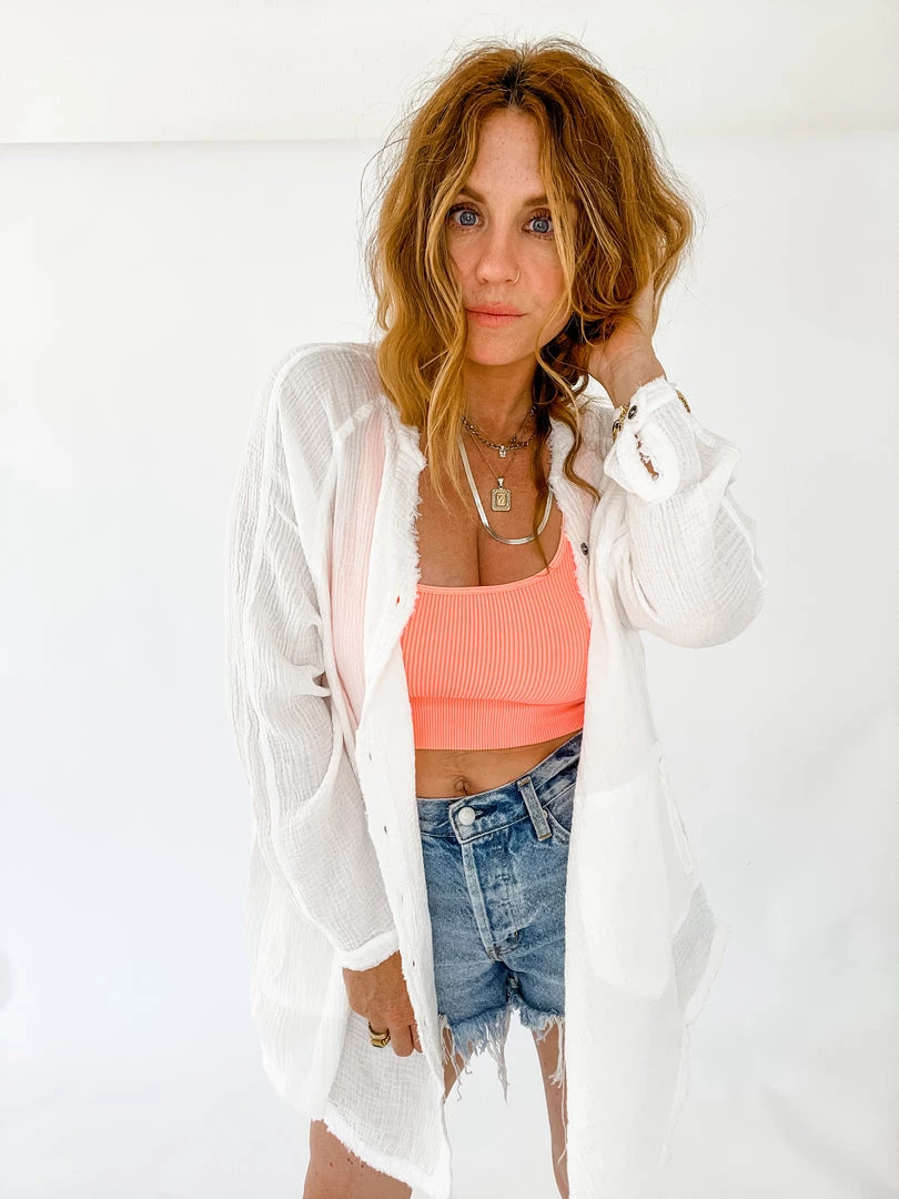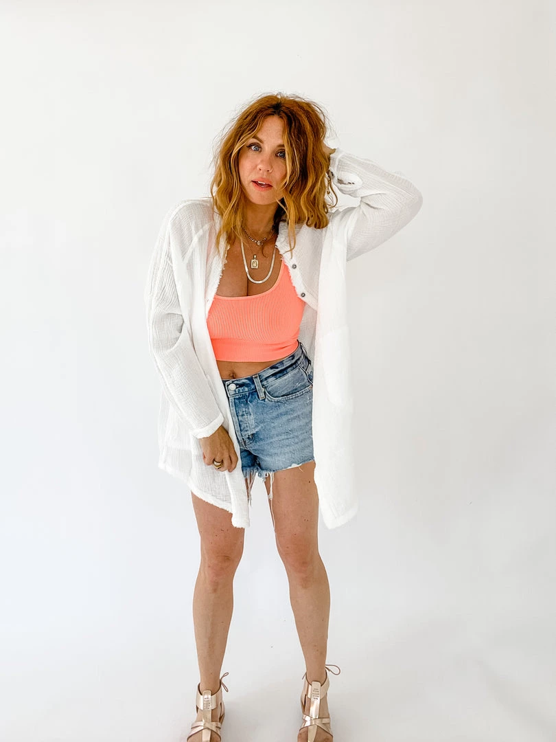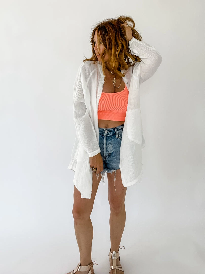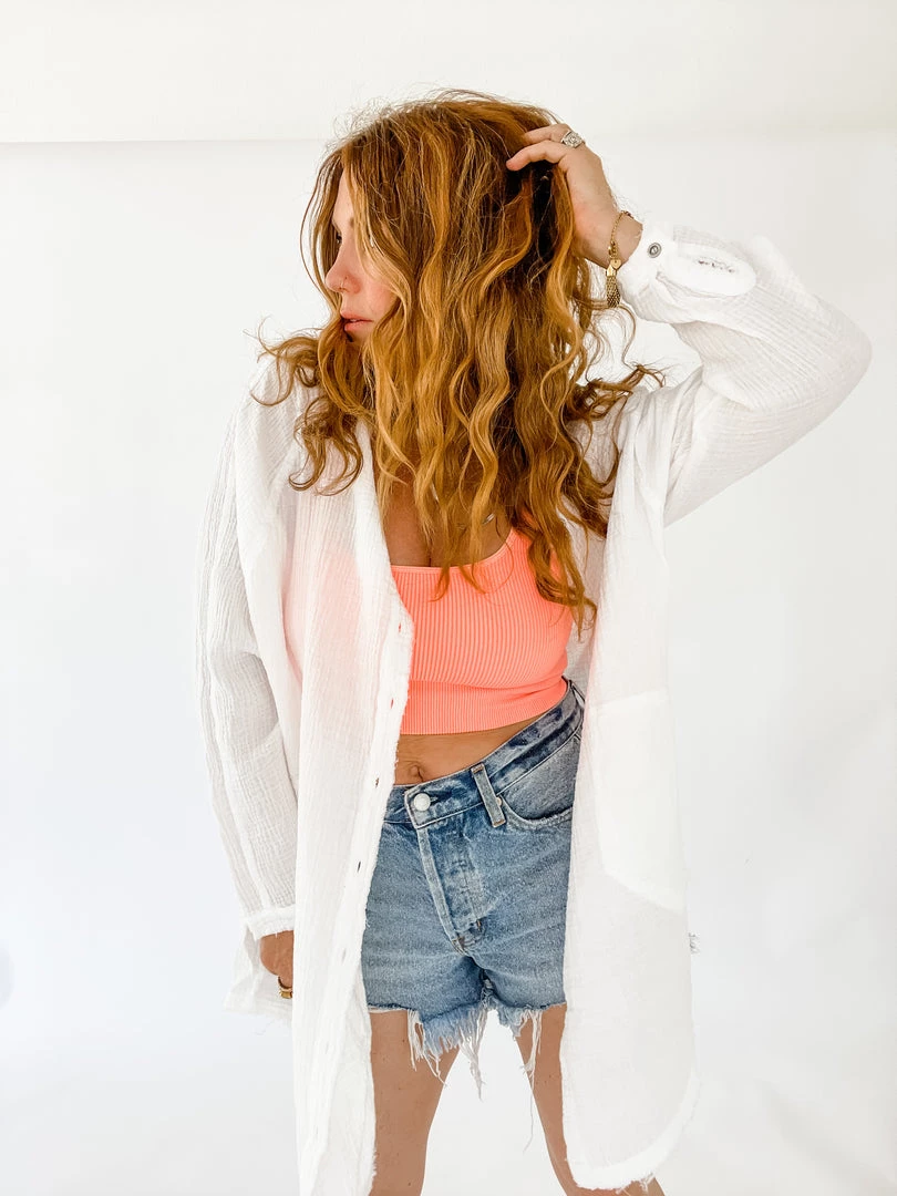 Fair warning…this gauzy, breezy and lightweight number is selling like hotcakes so grab her fast!! The Seaside Long Sleeve is the perfect Summer staple. SO many ways to wear this long sleeve button down; toss it over your swim or tie it over a sweet midi dress, we also love it paired with our new Sun Seeker Cropped Tank and Levi 501 Shorts. A slightly oversized fit that gives us all the laid back vibes we love!