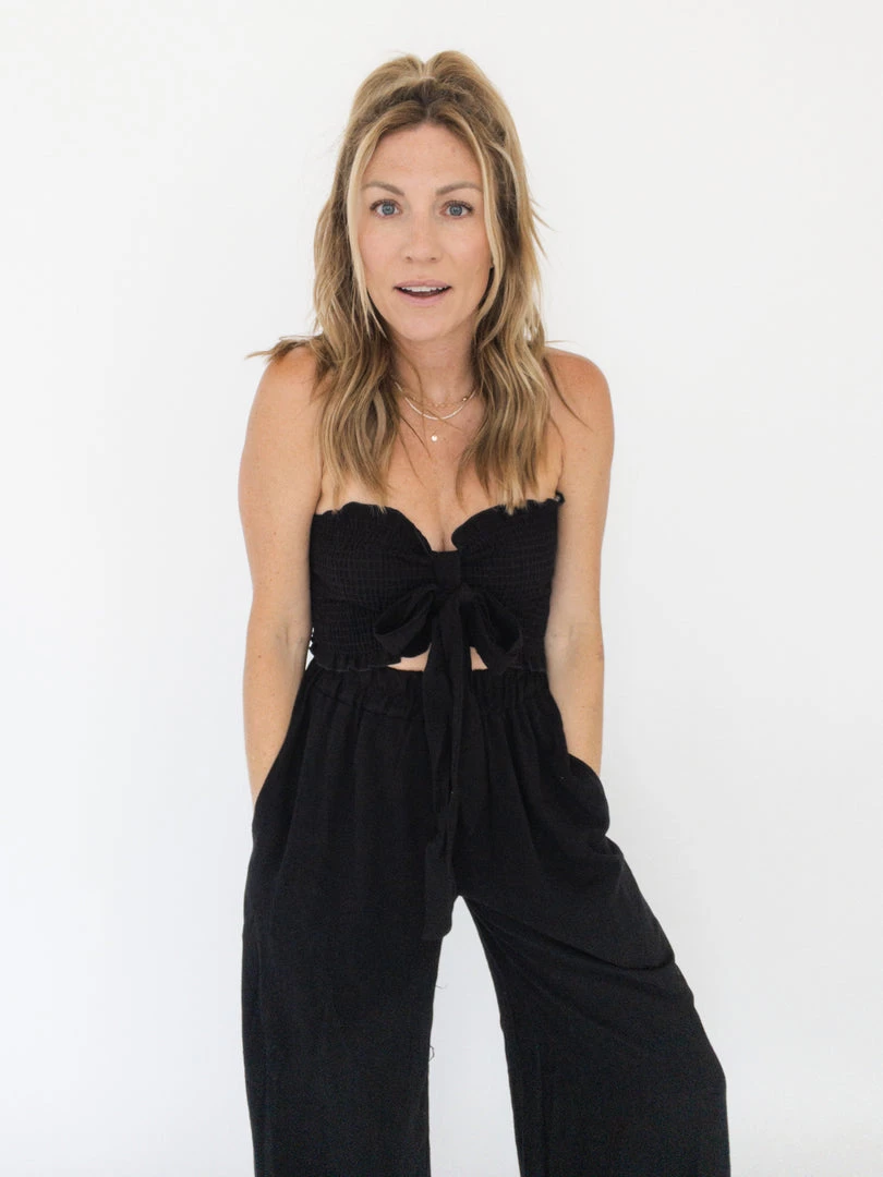 A wide leg pant with a high, elastic waist and side pockets pairs with a smocked crop with center front tie. Wear this duo separately or as a set whether you are brunching, somewhere tropical or a backyard hang. Versatile and a fun combo we all can not live without. Sold as a set.