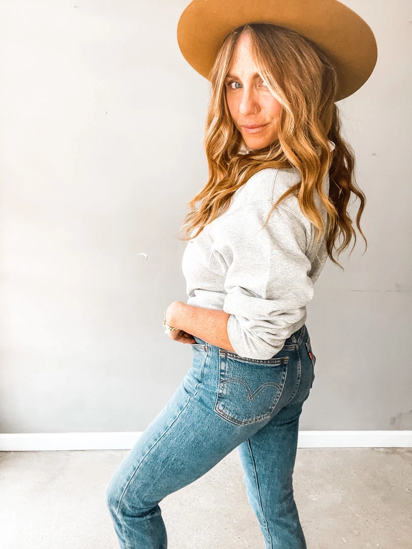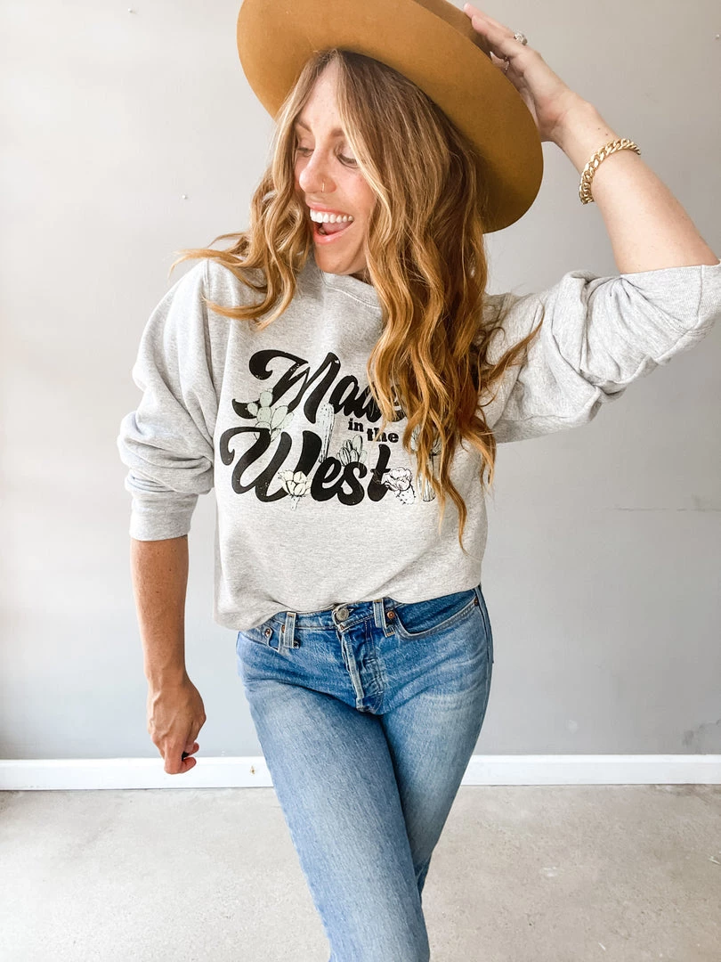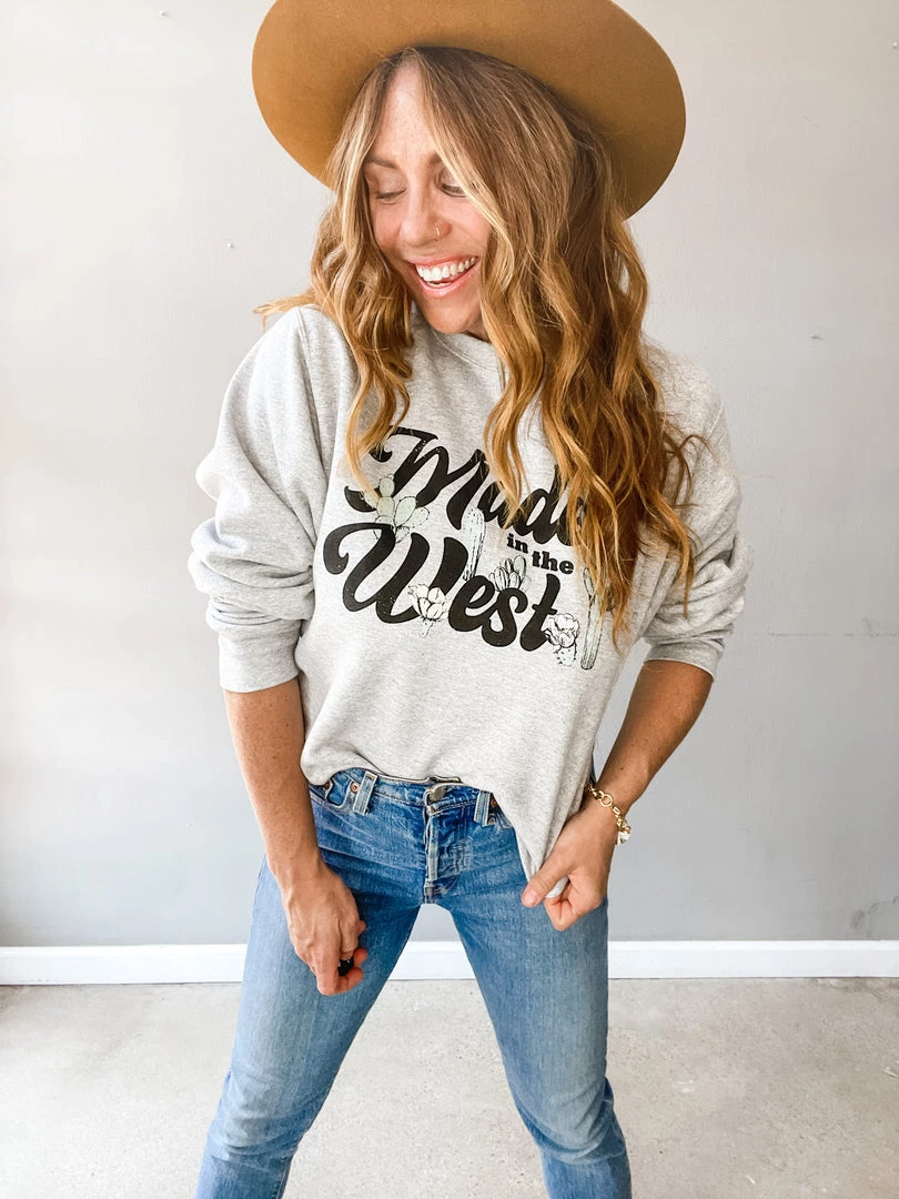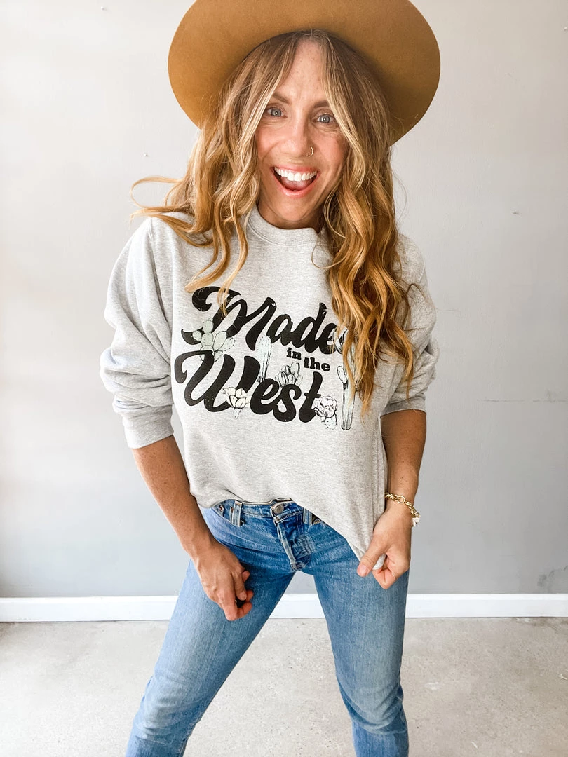 The Made in the West Pullover is a light heather grey oversized pullover that was made for the desert lover. Fun cactus and cactus flower grpahic featured on this easy + cute basic!