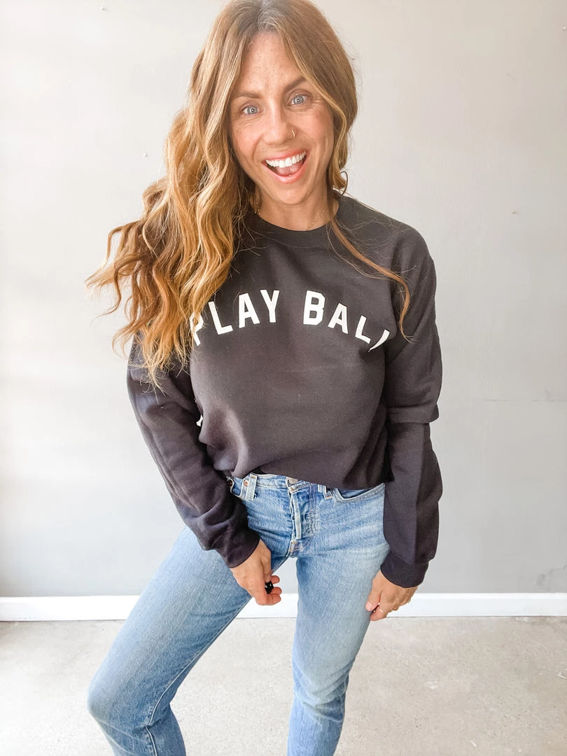 Calling all baseball mamas and super fans. This one is for you! A super cute, slightly oversized pullover that is oh so soft and flattering with “PLAY BALL” graphic. A simple and fun staple all season long!