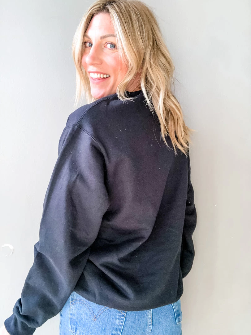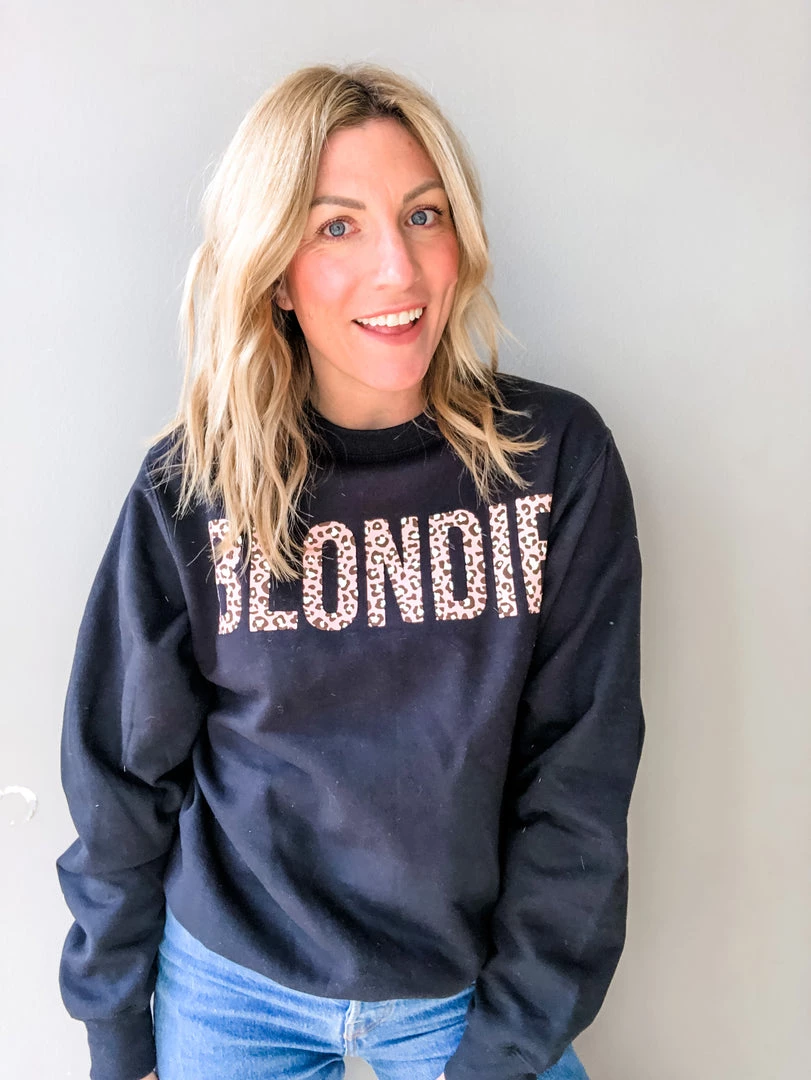 A great basic with a pop. The perfect pullover with a light pink leopard graphic on a black sweatshirt, a style that works in any gal’s closet!! We love the fun leopard print font on this loose fitting sweater. The kind of basic you can wear lounging or running errands.