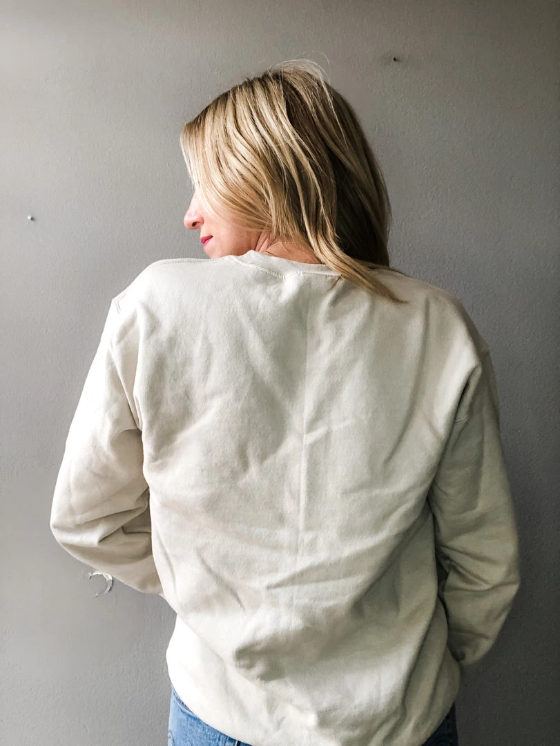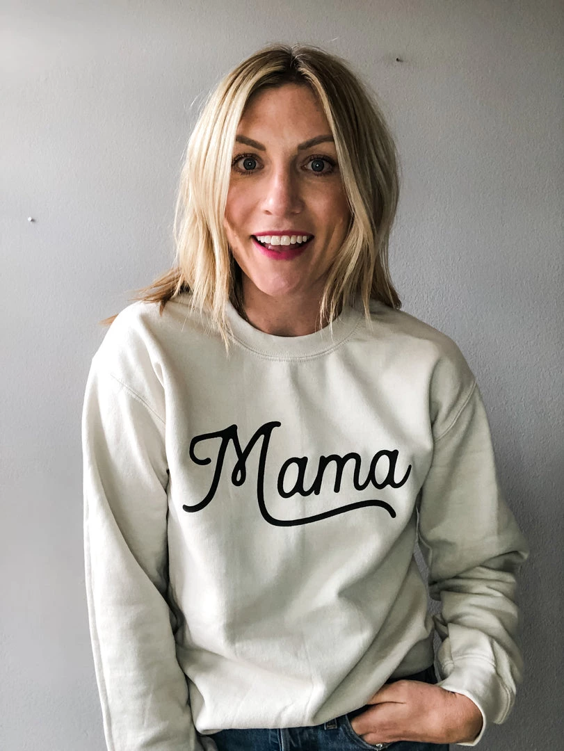 A crew neck sweatshirt with mama in a black cursive font. We love this sand color way for summer. Perfect to toss on with denim shorts. Buy for the special mama in your life or gift to yourself! Size up for a looser fit.