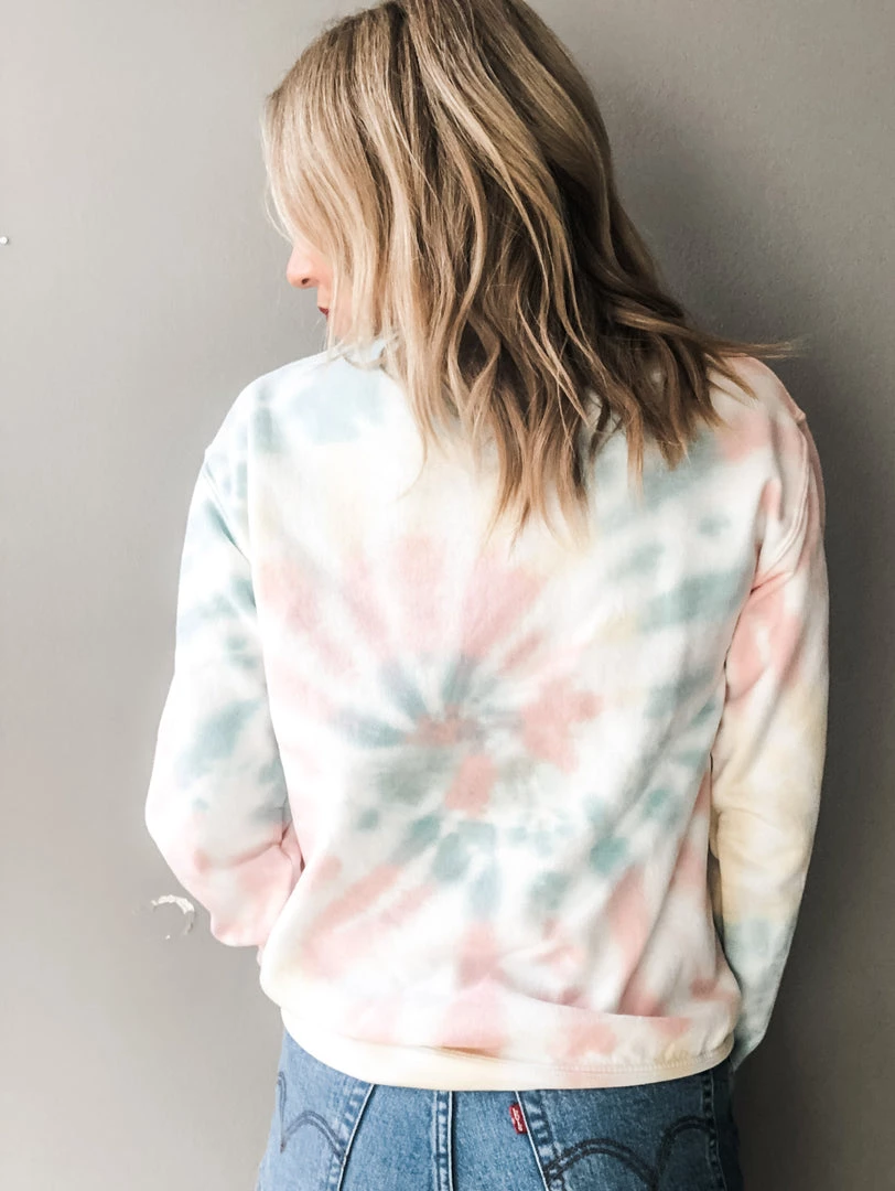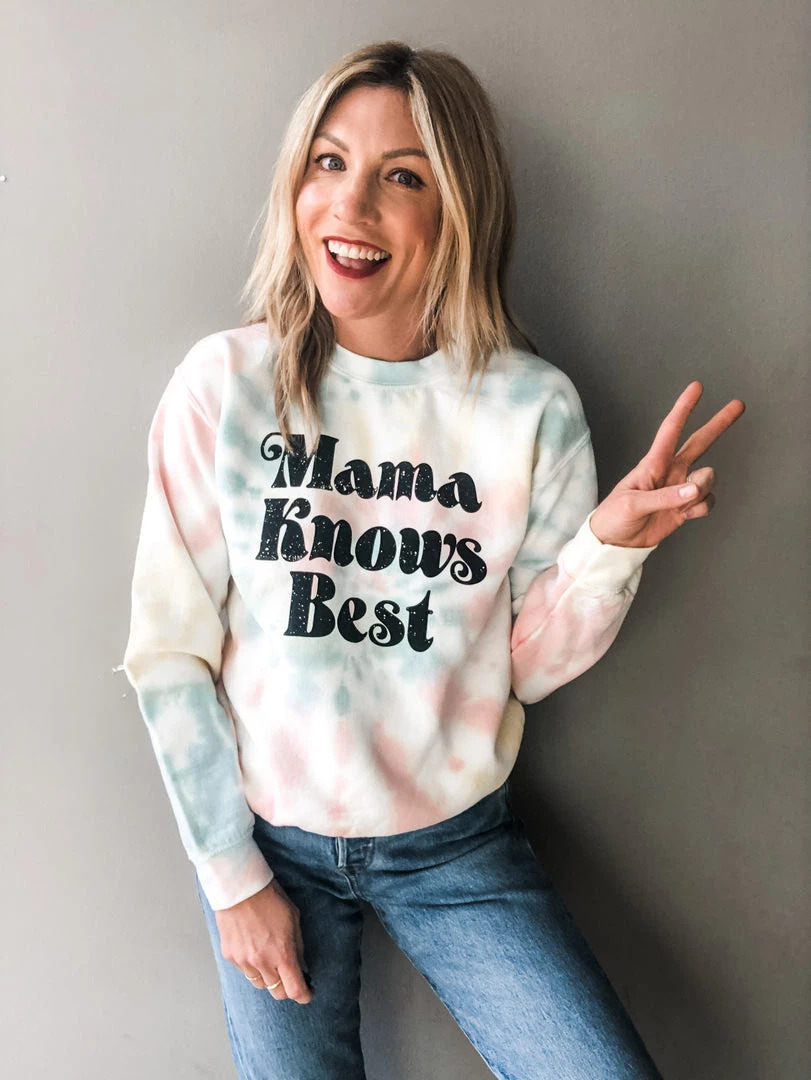 She sure does!! A pastel tie dye pullover crew neck sweatshirt with Mama Knows Best graphic in a fun black font. Perfect for lounging at home or paired with denim while playing with the kiddos at the park. Fits true to size.