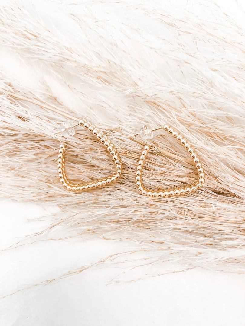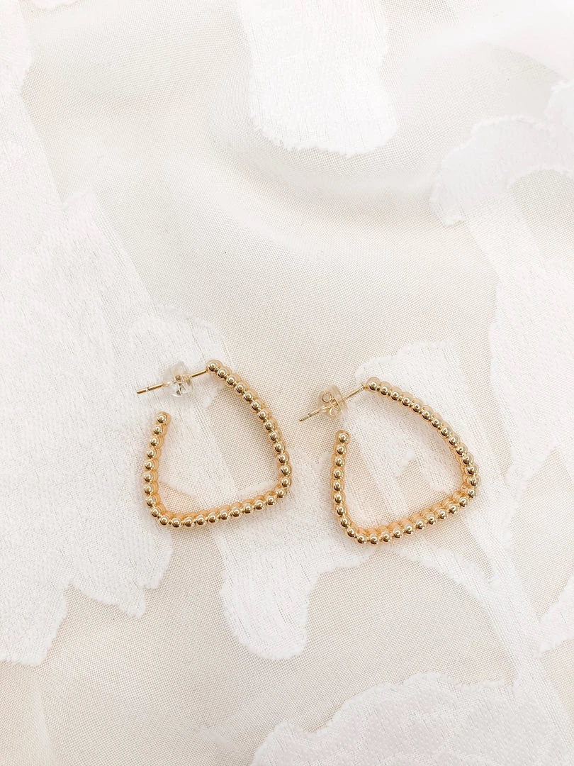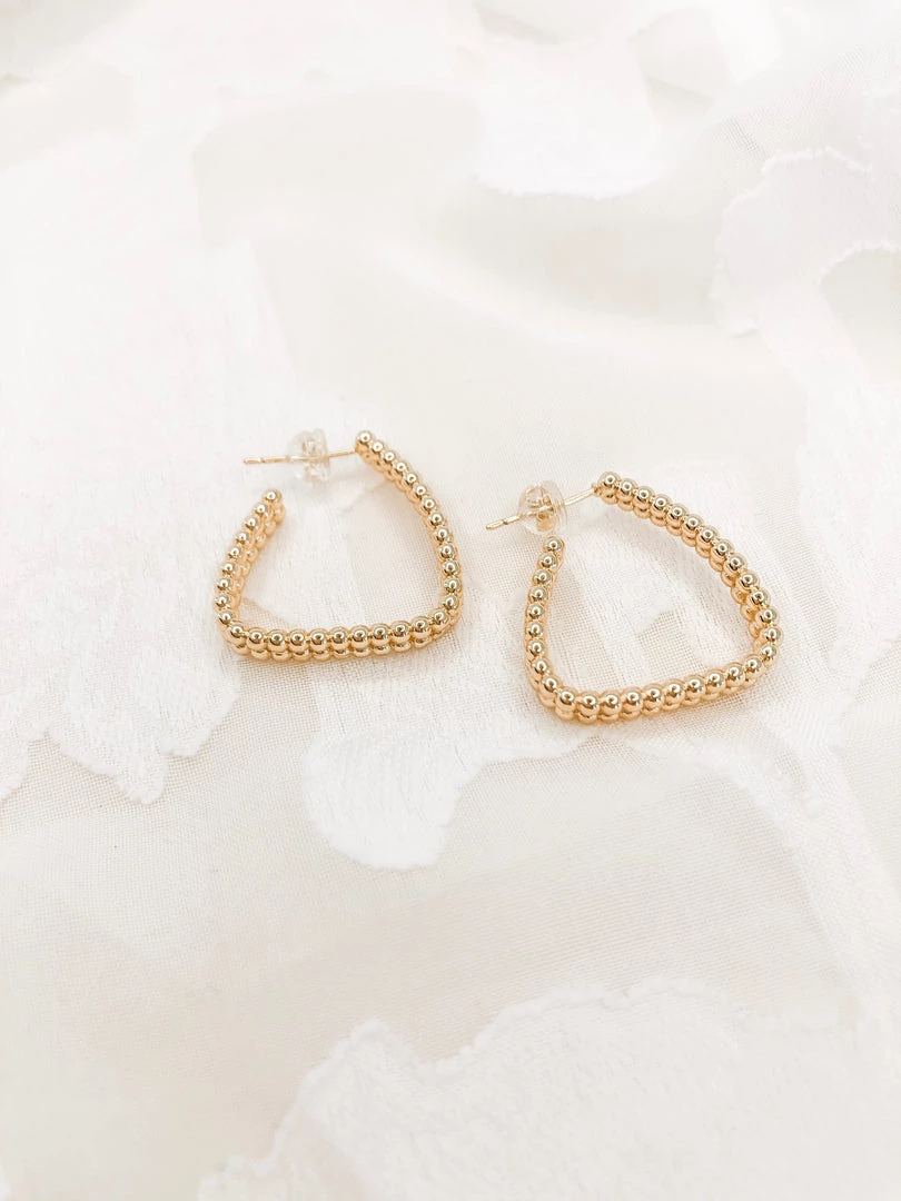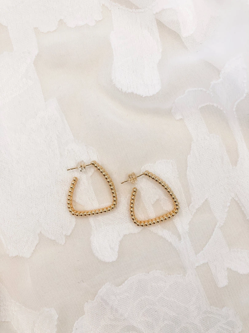Simple, classy, elegant! These Bermuda Hoops add subtle spice to your look. They’re triangle hoops comprised of tiny gold beads, so the gold sparkles nicely and catches your eye!