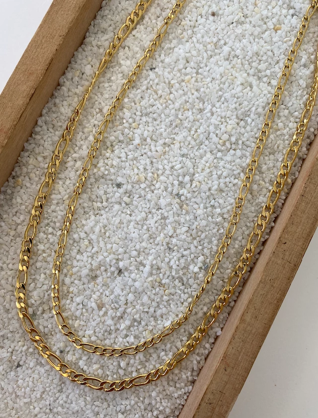 A gold plated double layer chain necklace with a single clasp at the back. Water and tarnish resistant. Perfect for everyday wear.