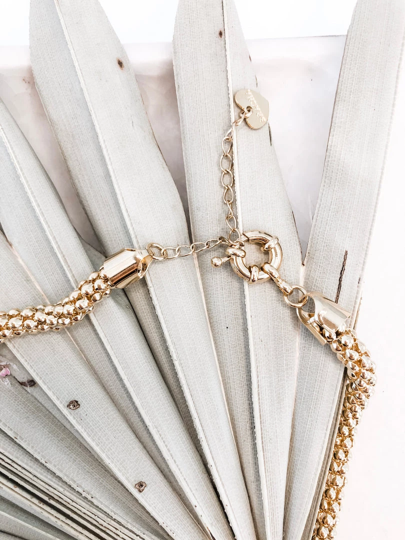 We love this chunky gold chain for it’s simple boldness. It has an intricate weave and hugs a bit closer to the neckline. It’s chain length is adjustable at the clasp.