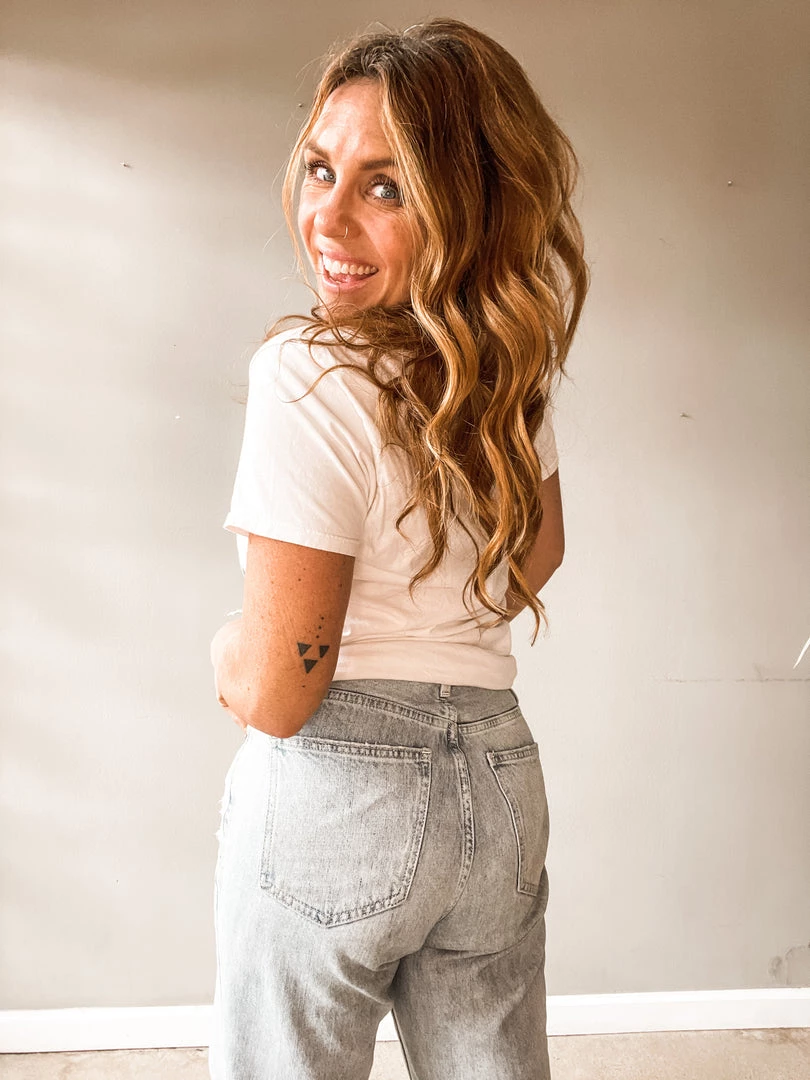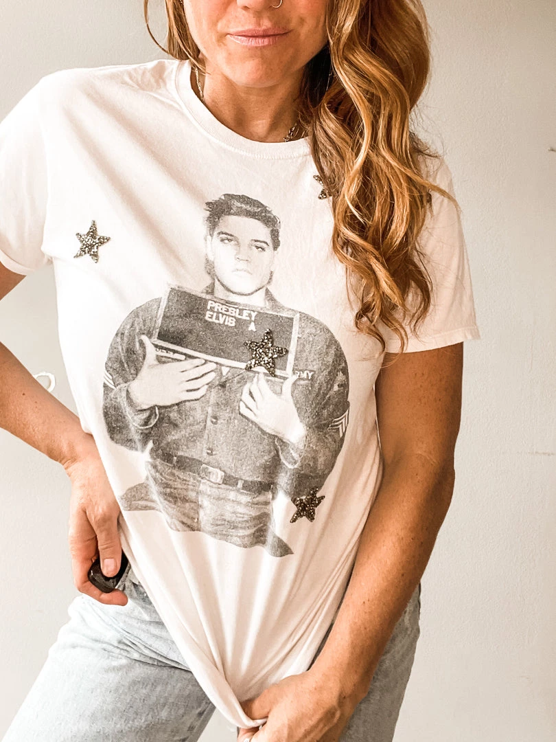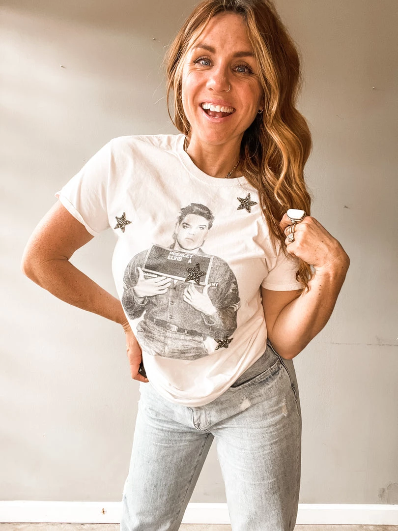Who doesn’t love a great Elvis Tee? Especially when its this soft, crisp white, and has funky star patch details we love on it!!! This fitted tee has a longer silhouette and is a great piece to pair with any and all of your fav jeans, midis and maxis!