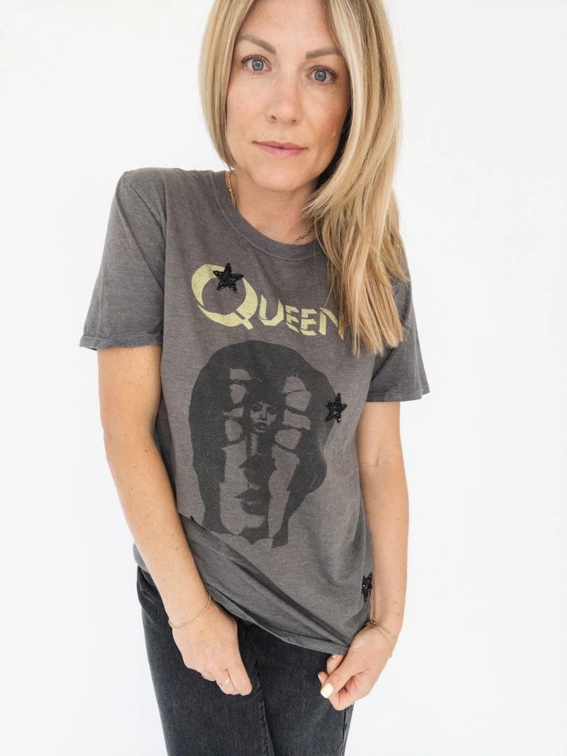 The Star Studded Queen Vintage Tee is a one of a kind vintage Queen tee with embellished black sequin star details.