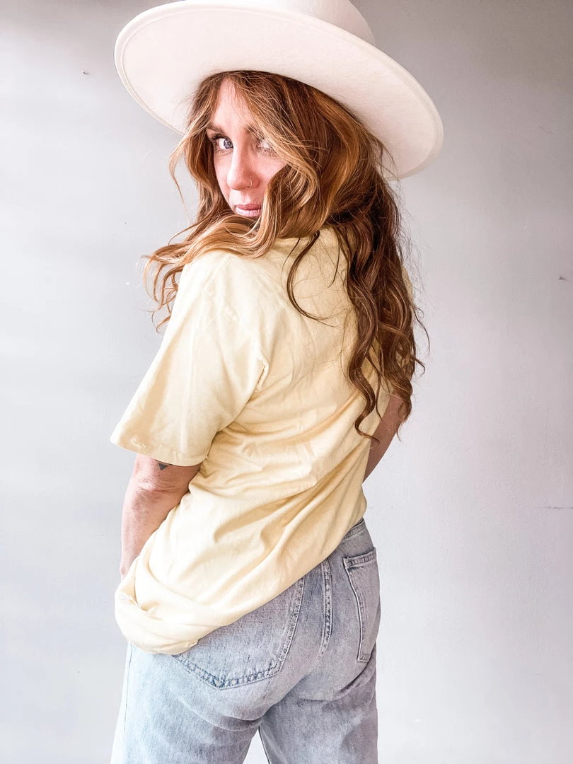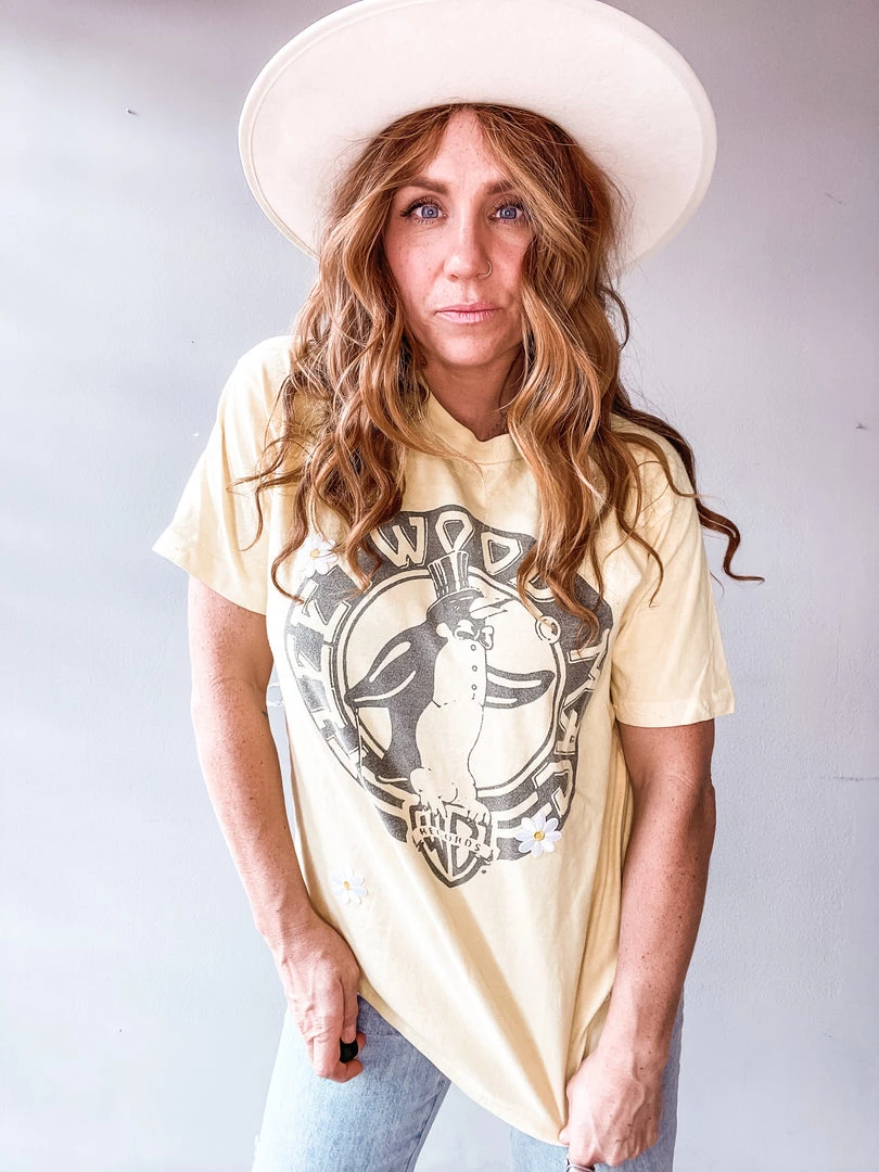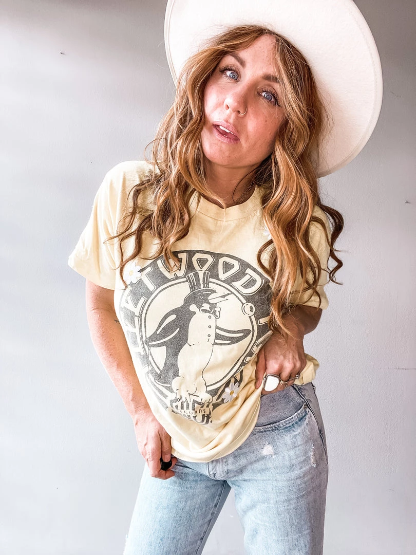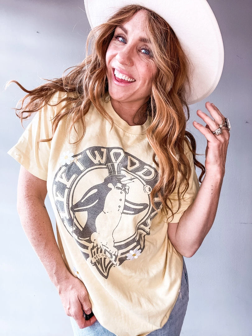 The Fleetwood Mac Custom Vintage Tee is a one of a kind vintage tee design on a super soft and slightly oversized yellow Fleetwood Mac Band Tee. We love the daisy patches that complete this one of a kind, super soft, boxy tee!