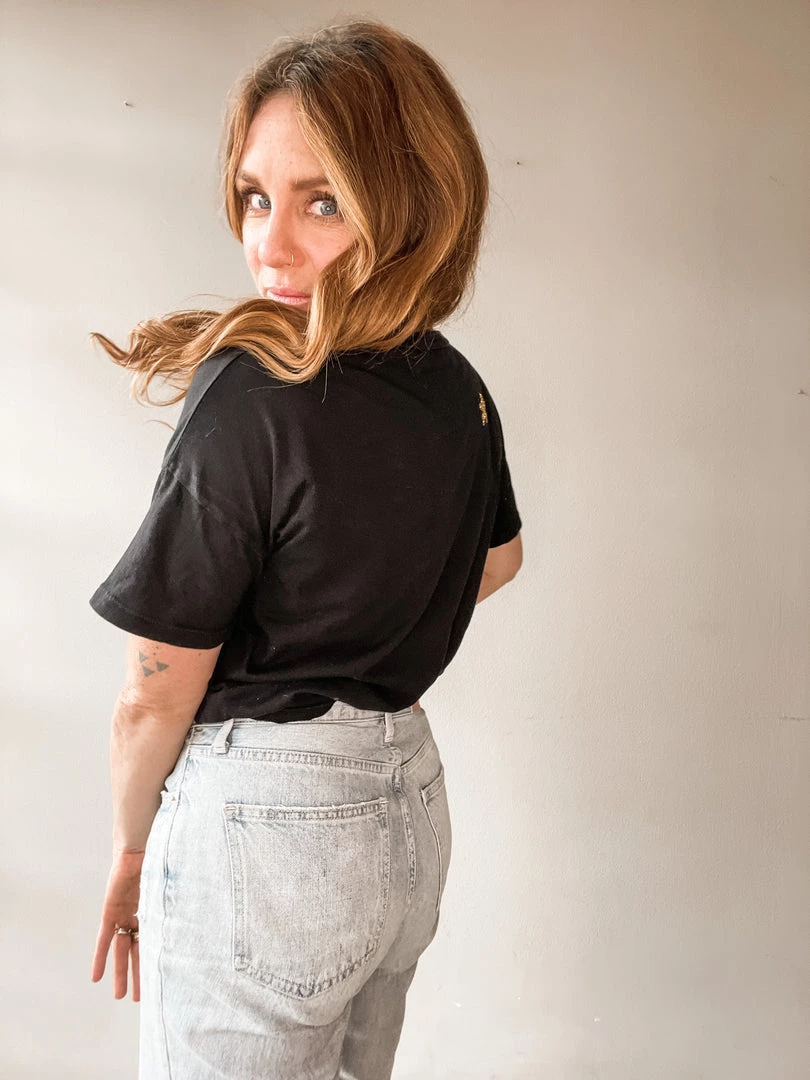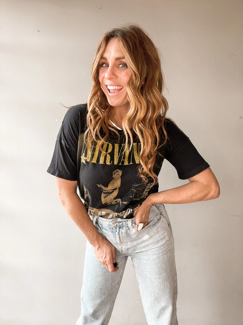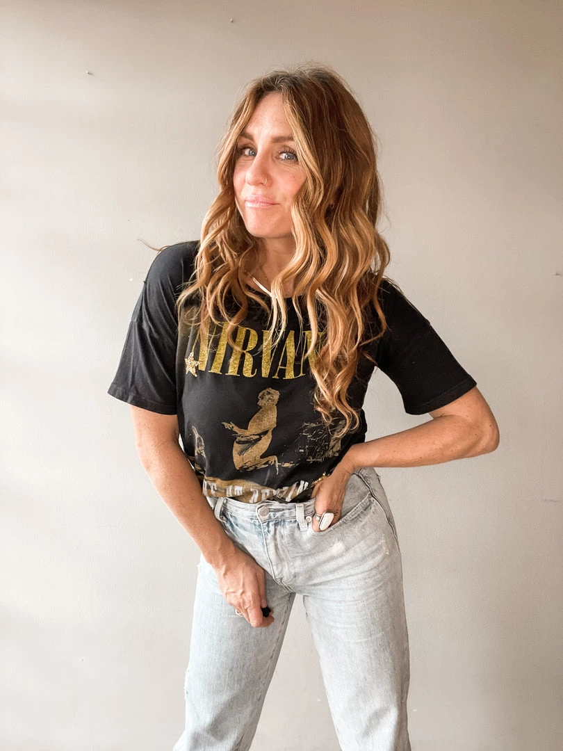 This new line of one of a kind vintage band tees is just too good!! The Nirvana Tee is a slightly cropped vintage tee with a boxy fit, and fun glittery star patched details. We love the super soft feel of this vintage classic, with a kick!