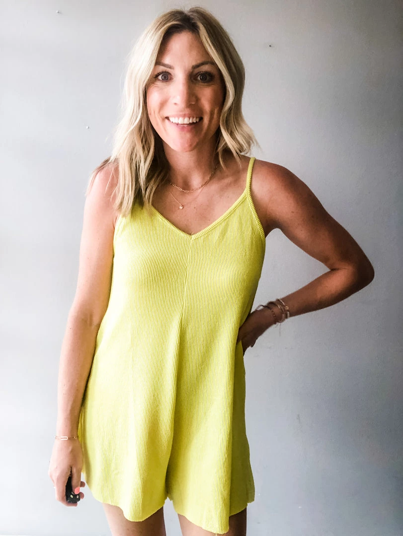 A bright lime rib knit romper perfect for those toasty summer days. Features a double v neck with spaghetti straps. Toss on over a swimmie or for everyday wear, a great lightweight option for pool or beach hangs.