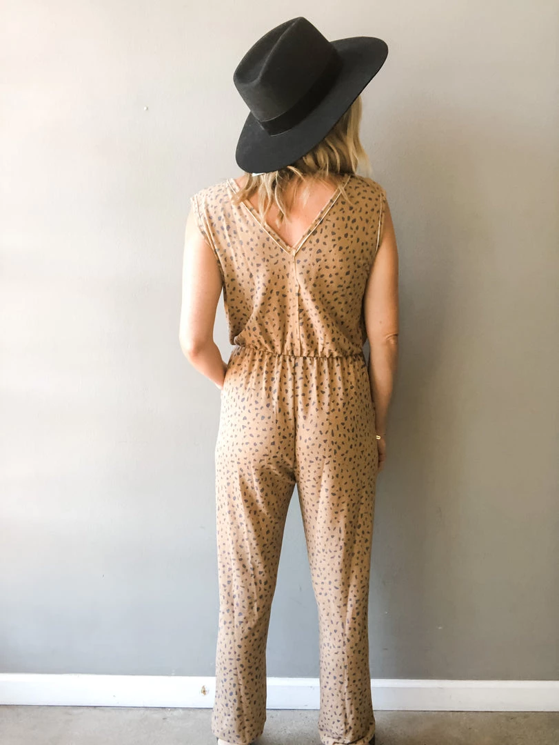 A spotty print knit jumpsuit with v neck, drawstring elastic waist, side pockets and jogger style legs with elastic cuff. Toss on with a pair of sandals for an effortlessly chic summer outfit.
