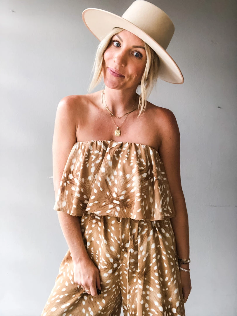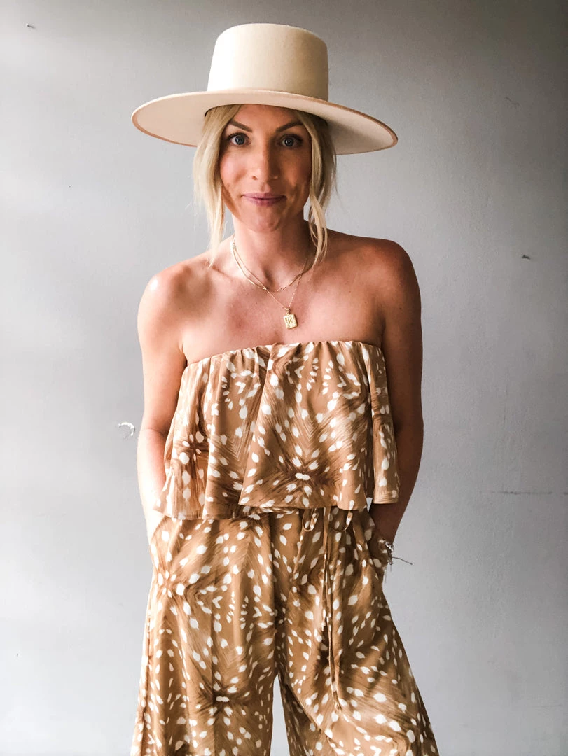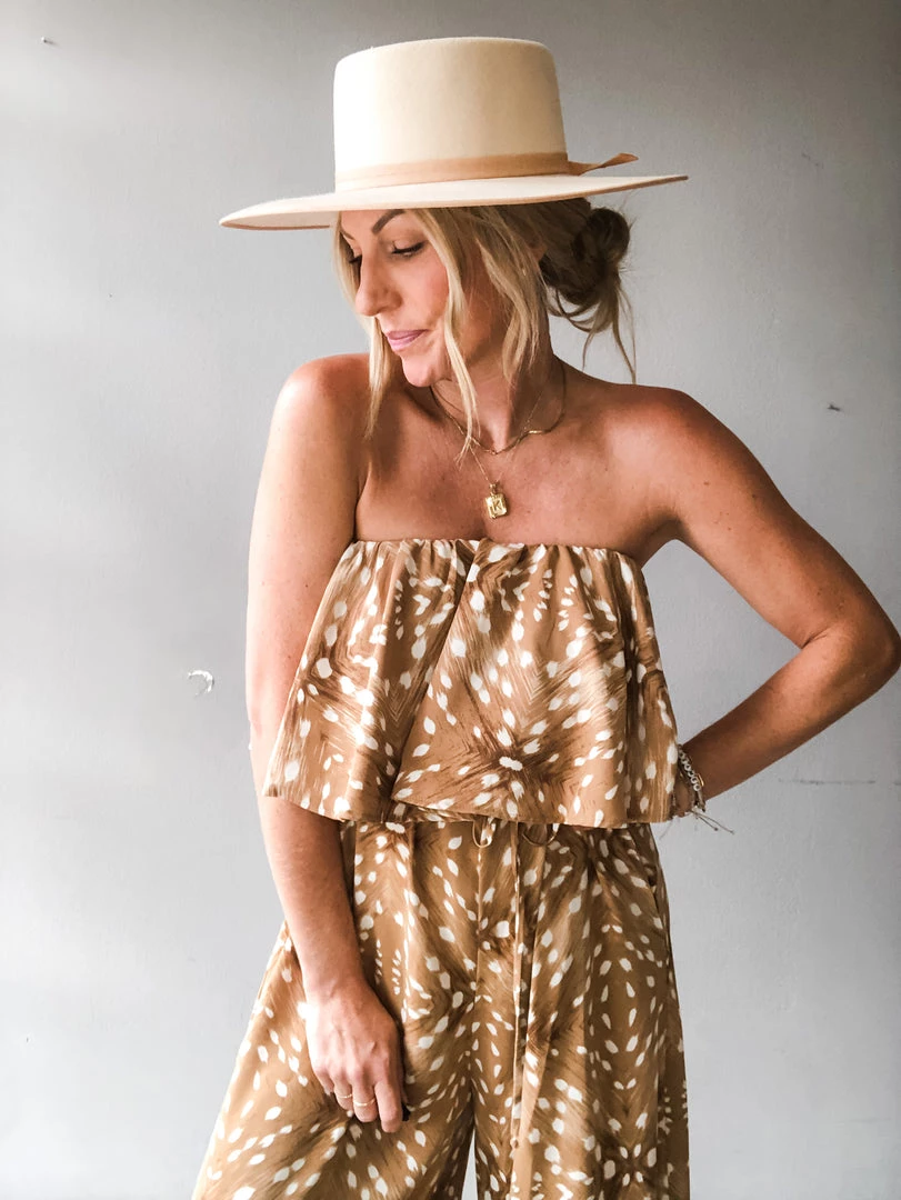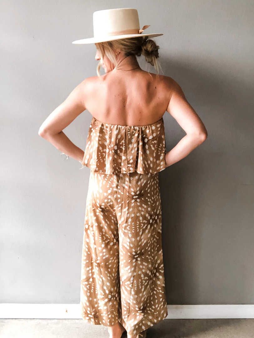 A strapless, cropped jumpsuit with ruffle detail, side pockets and tie at the waist. Perfect for vacation or a night out. This piece is versatile and can be layered with flats or a bootie and worn under a leather jacket for a dressed up look.