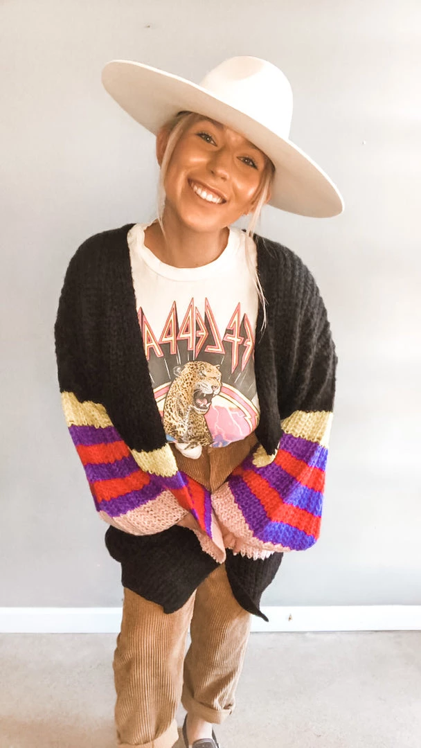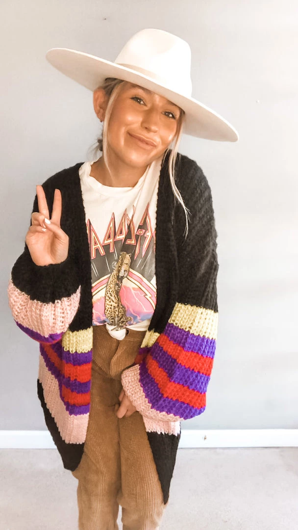 The Bright Horizon Cardigan is one of our favorite pieces of our newestdrop! This oversized style cardigan has a fun bright striped detail with deep side pockets and bell-like sleeves. A great cozy piece with a thicker knit…perfect to pair over graphic tees or basic tees and tanks. Make this the statement piece of your whole look!