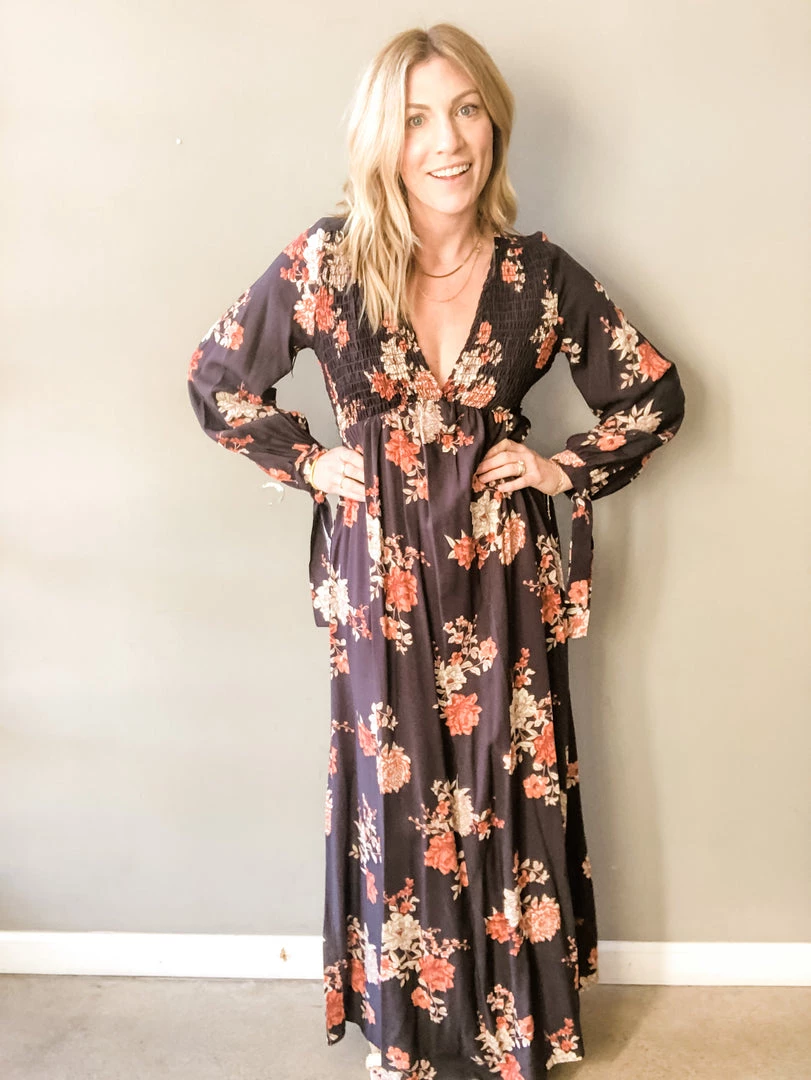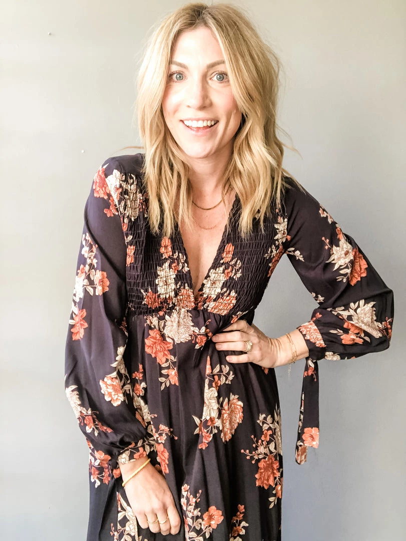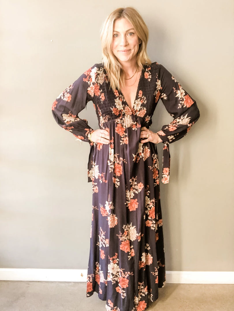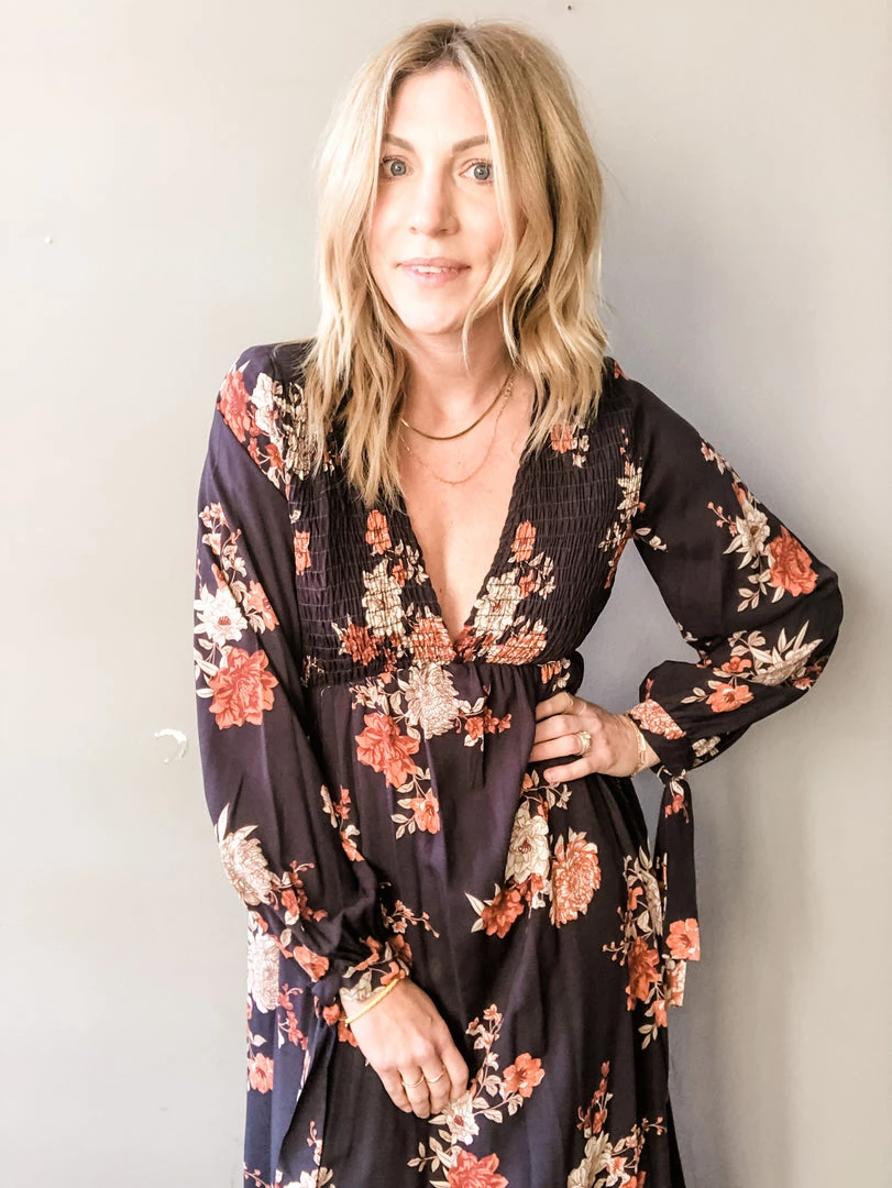 A floral printed woven maxi dress that is guaranteed to turn heads. Features a loose long sleeve with self tying cuff, smocked V neckline and shirring waist back detail. A flattering fit and versatile dress that can be worn for many occasions.