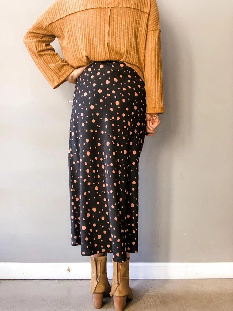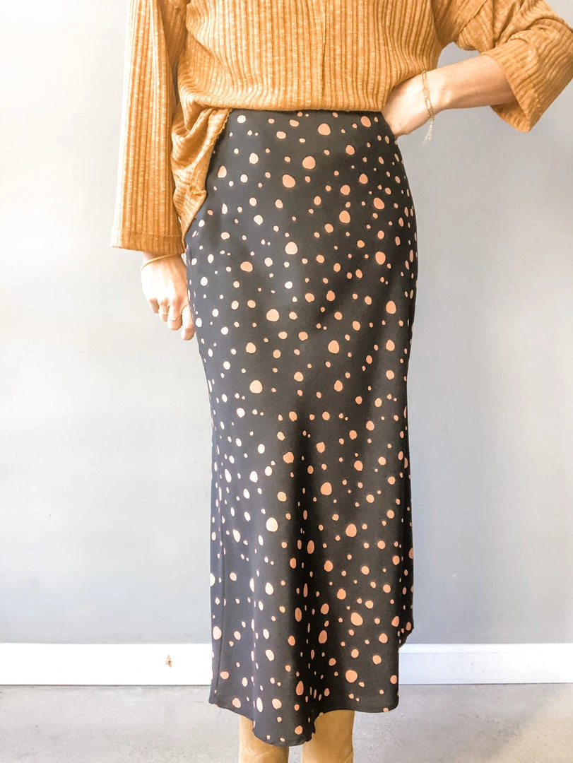 Suckers for a midi skirt and its ease and versatility. The Speckled Midi Skirt is a pull on slip style skirt with an elastic waist. Can be paired with a tee for a casual cool look or with a sweater for something dressier. A perfect year round staple for any wardrobe.