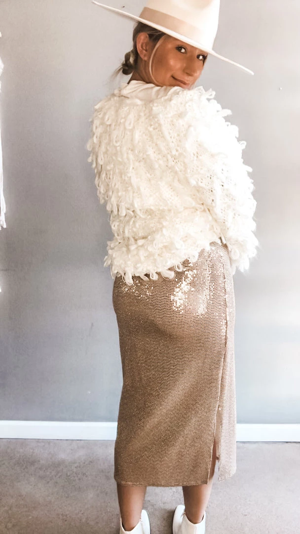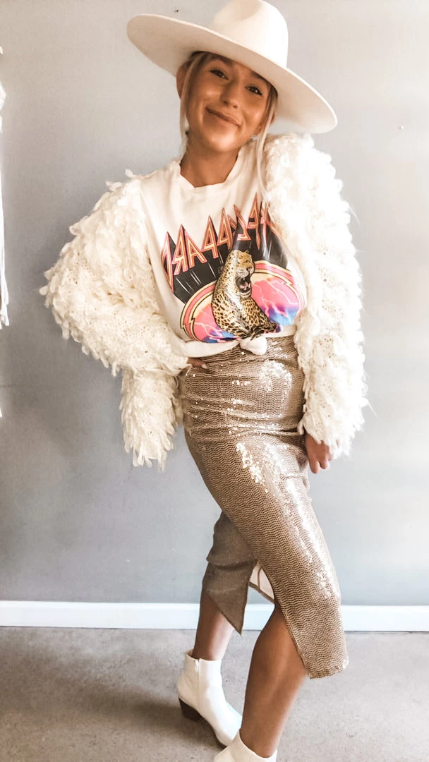 The Disco Babe Midi Skirt is a sequin delight. A statement piece that we kinda like best worn as a basic. Pair it with your sneakers, boots, and a graphic tee and you are set for a fun outfit with lots of glam! This mid length, high waitsted, stretchy fitting skirt features a fun side slit and easy silhouette!