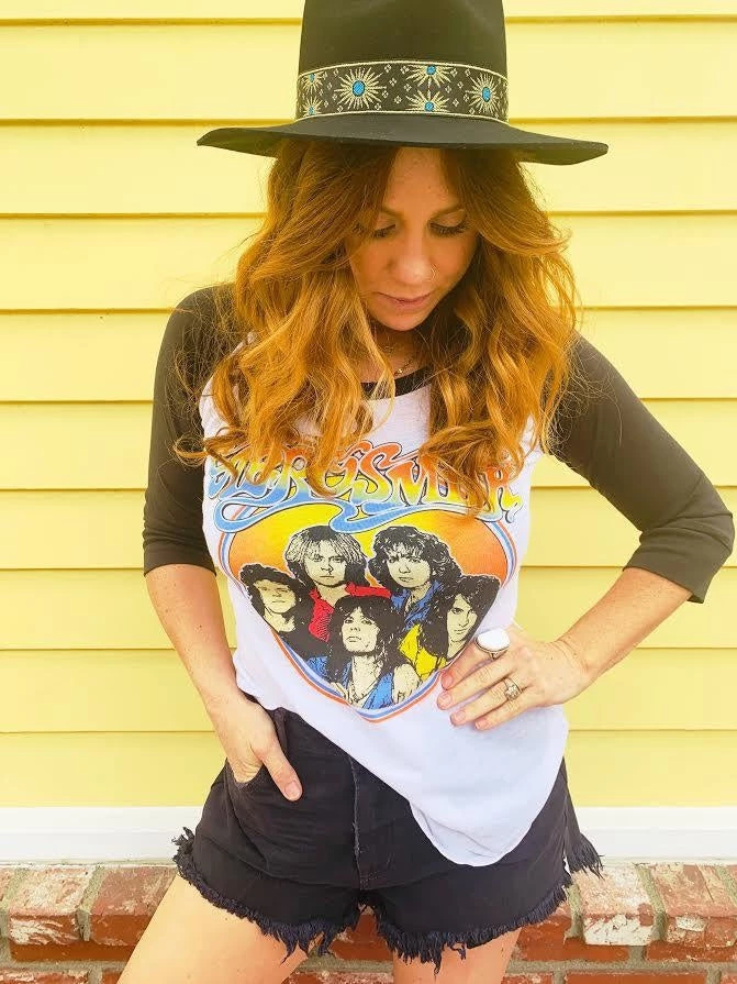 A vintage style baseball tee with a perfectly faded aerosmith graphic. A soft jersey with contrasting sleeves and curved hem, relaxed thru the body with fitted sleeves. Thin, vintage-style fabric. (Model wearing size medium)