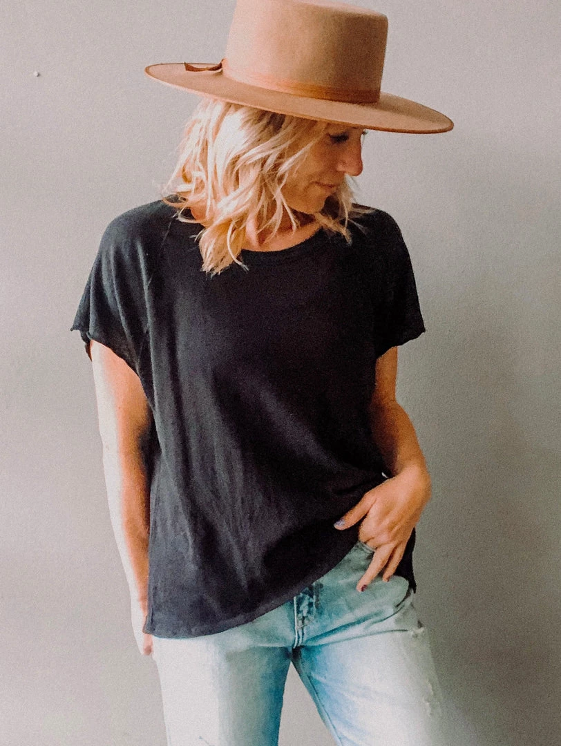 The Chaser Cap Sleeve Raglan Tee has a very slight high-low hemline , capped sleeve and boxy, loose fit. Our version of the perfect basic tee for any occasion. This tee is so soft…made of delicious gauzy cotton jersey. You can sleep in it. Play in it. Or wear it to a fancy dinner. Our kind of girl.