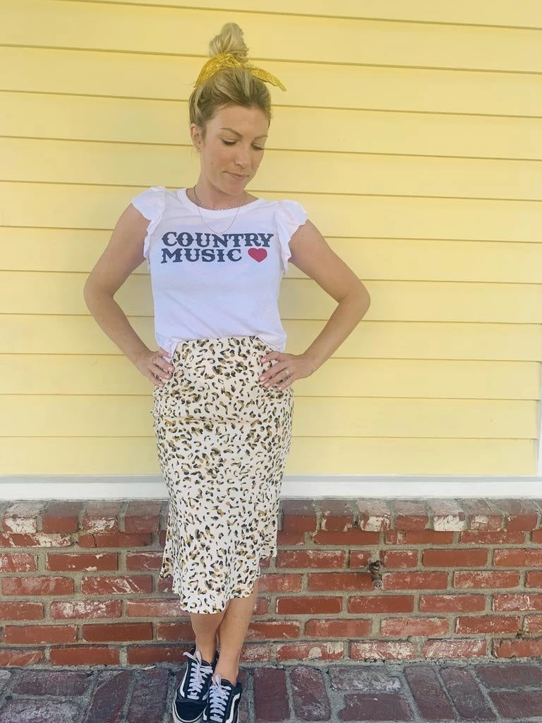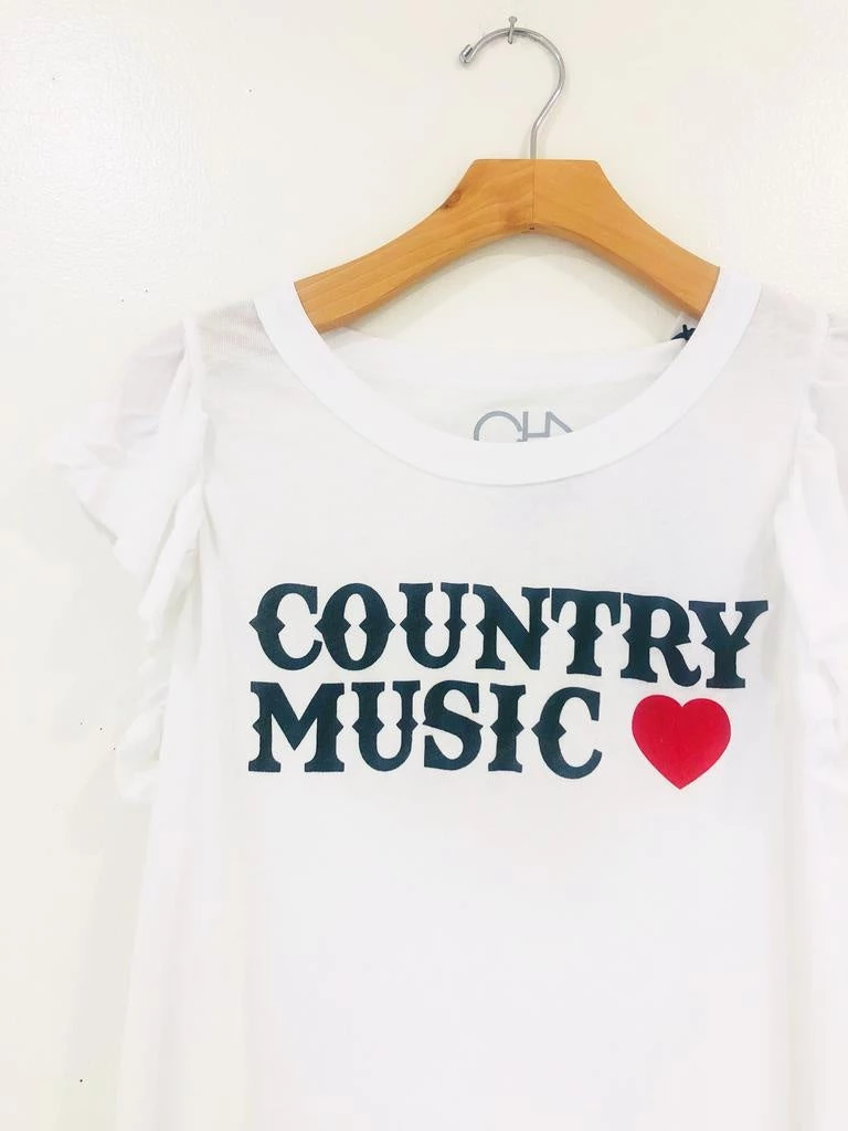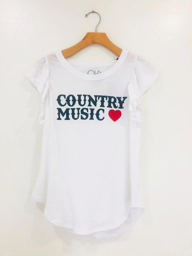 Kick up some country cuteness in this ruffle sleeve ‘Country Music” tee. A soft cotton tee that pairs well with bare feet, ripped jeans and some twangy tunes. Runs true to size.