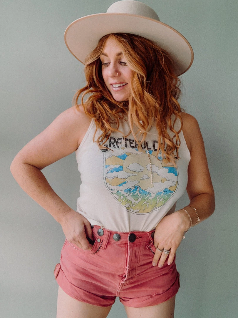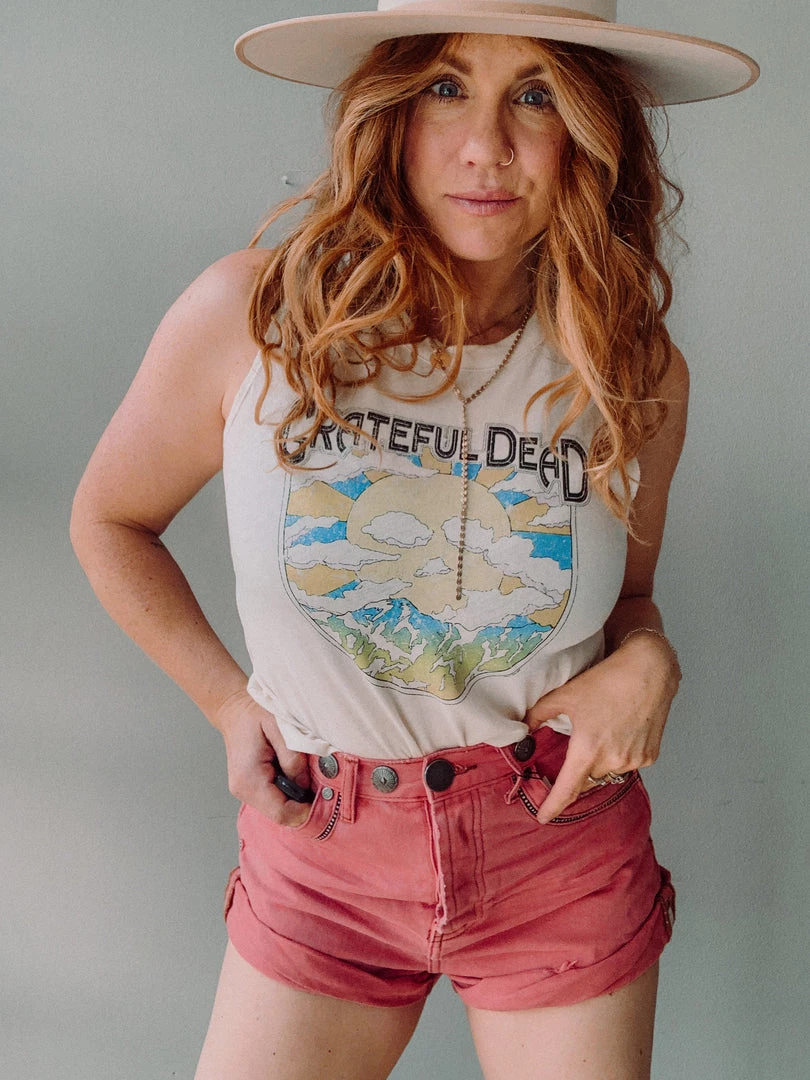 Our Chaser Brand Grateful Dead Muscle Tank is a great vintage-style graphic tee with a slight hi-low hemline and muscle tank fit. We LOVE the muted grateful dead graphic tones of this perfect little band tee basic. Worn under overalls, with cutoffs or with all your favorite summer midi skirts, this super soft, looser fitting tank is a summer staple.