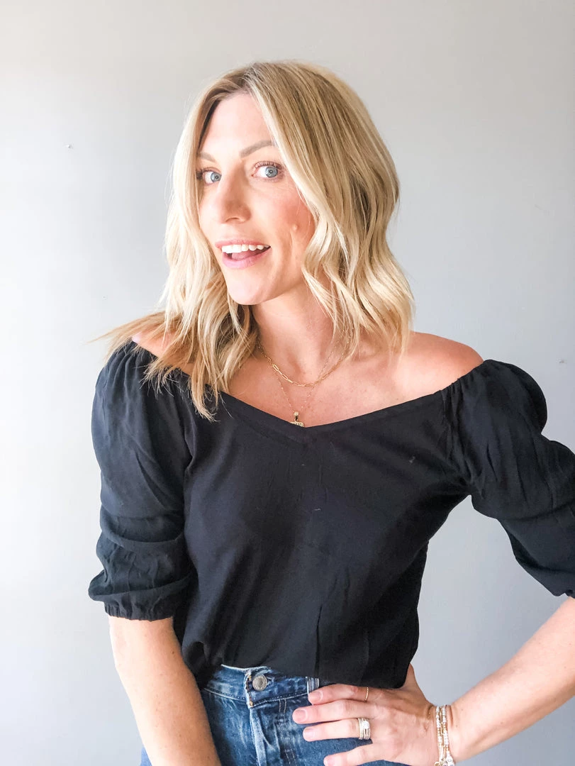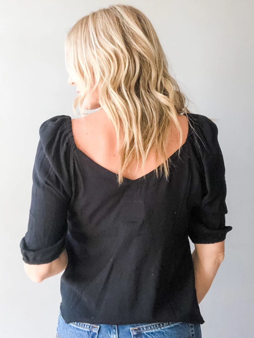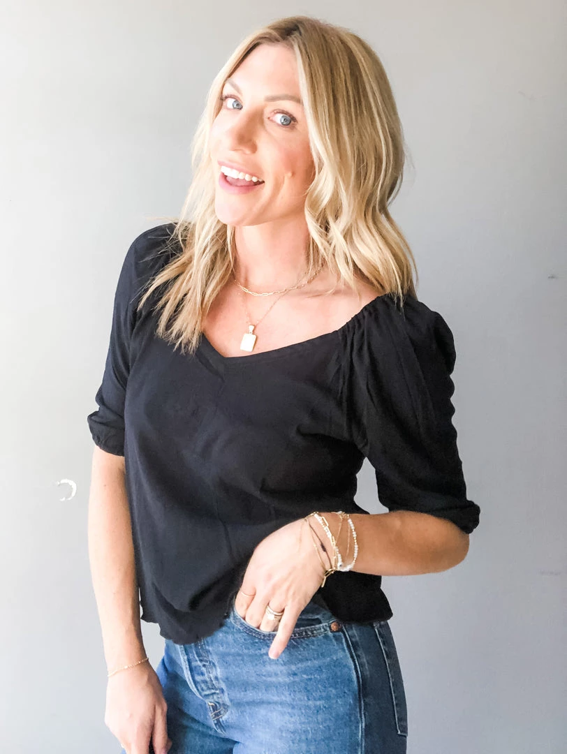 Go from work to drinks in this versatile top that we absolutely love! The flouncy silk-like piece features a double-V-neck with shirred sleeves that you can wear on or off the shoulder, tucked in or left loose. Black is always in season, so prepare for plenty of wear. Pair with jeans, and your day-to-night ensemble is set.