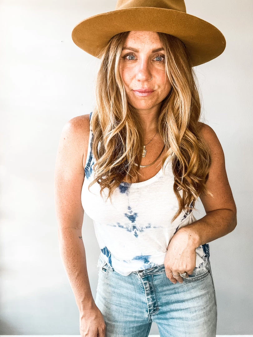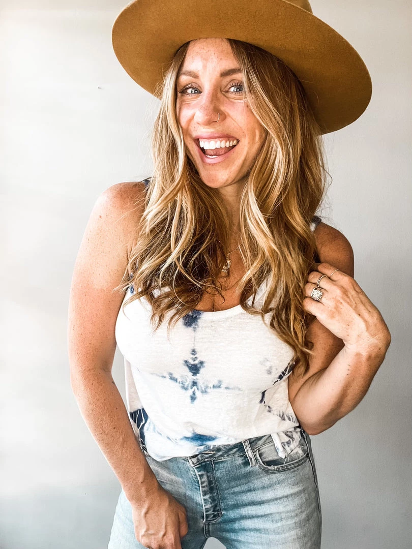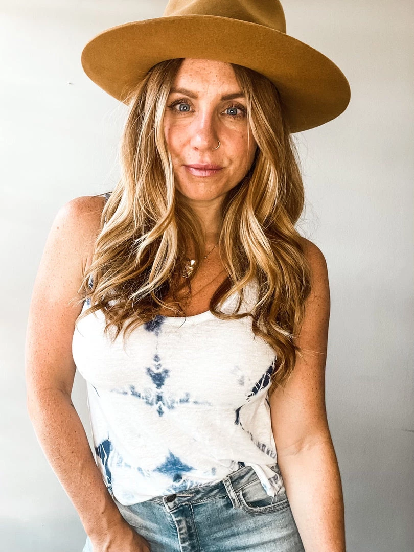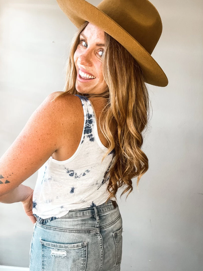 An eye catching indigo tie dye print scoop neck tank that is a great casual summer go to. Pair with your fav denim cutoffs for a laid back look we love.