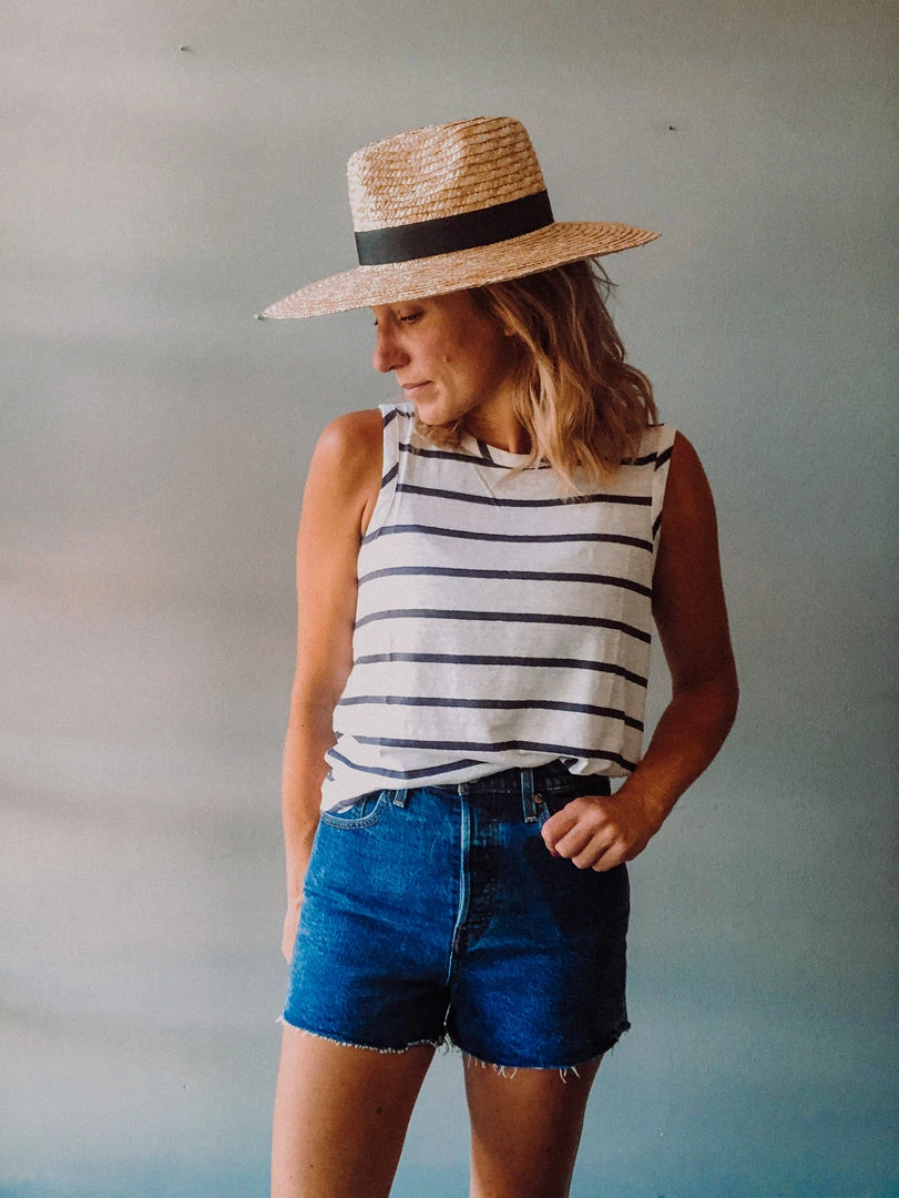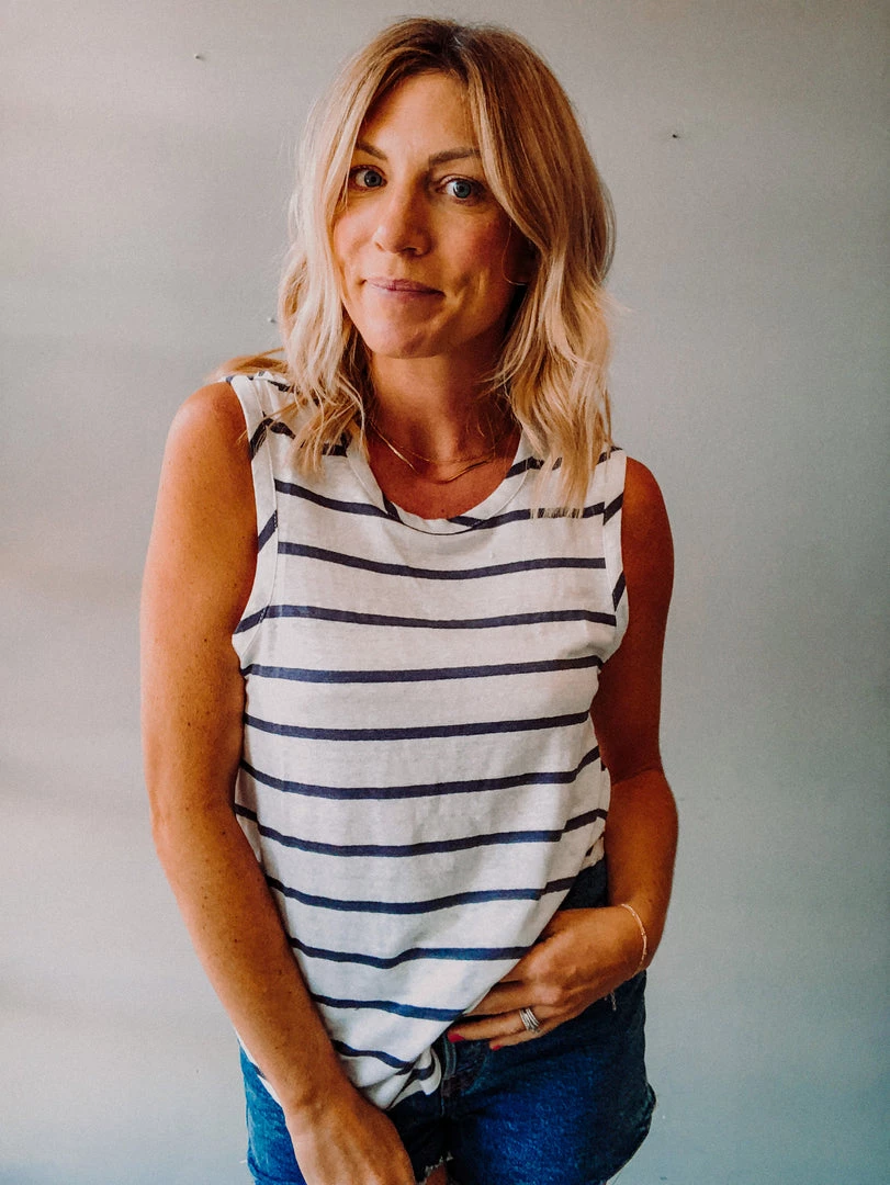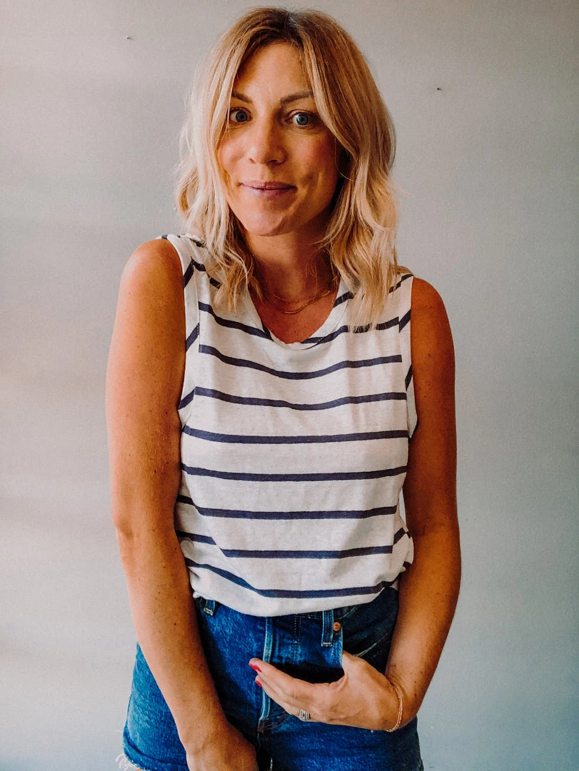 A linen striped muscle tank with scooped hem and high crew neck. Such a great basic that can be worn with your fav denim.