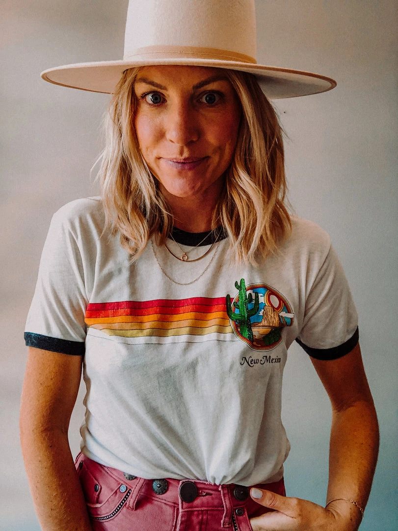New Mexico Ringer tee with a fun vintage vibe. Made of a recycled polyester blend this graphic tee is super soft. Fun to pair with your fav denim and add a little southwest flare.