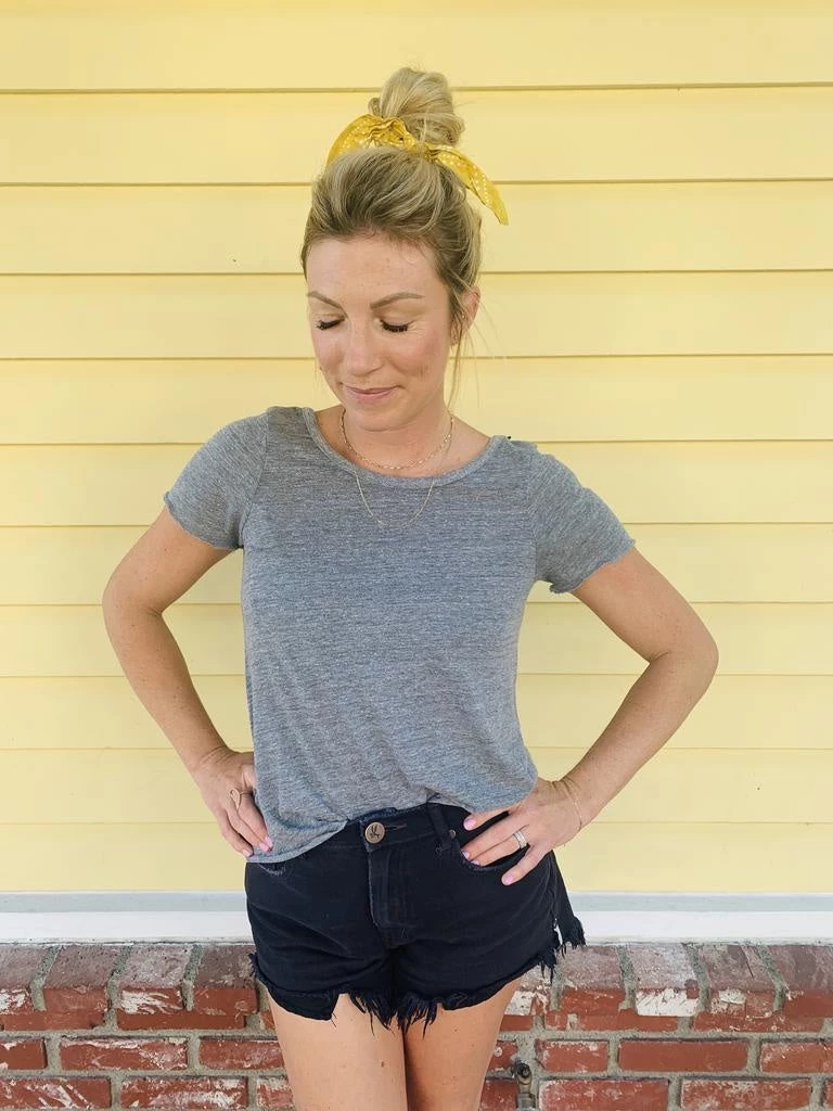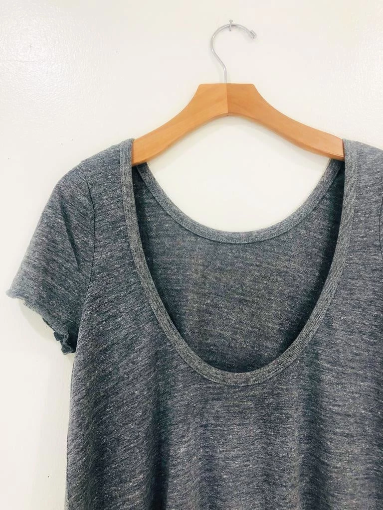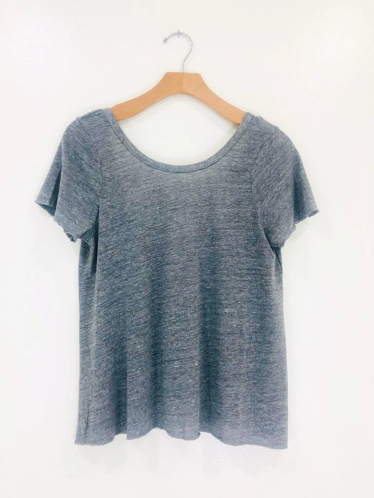 This deep sccop back tee is a fun update on a classic basic! An uber soft fabric in that perfect faded vintage colorway. This short sleeve a fluncy fit and makes for a dramatic exit. Model wearing size S.