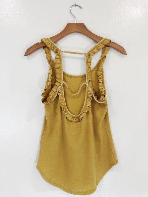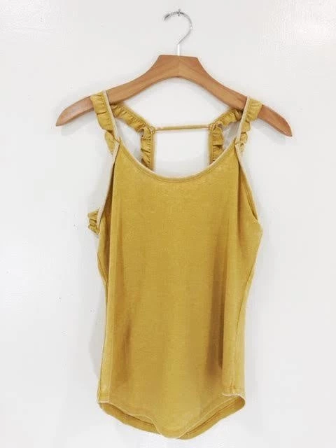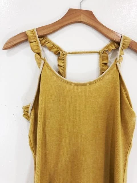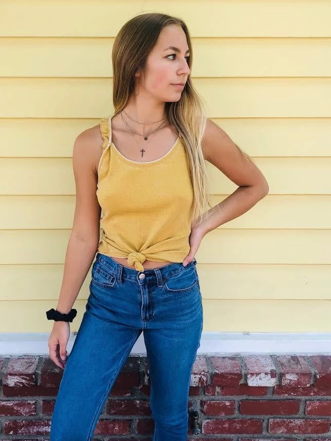 Ribbed, ruffled and ready for anything coming your way. This strappy ruffle tank features a caged back with scoop neck detail and curved hem. The perfect worn-in dijon colorway – you”ll feel like you’ve been kissed by the sun. (Model wears a small top).