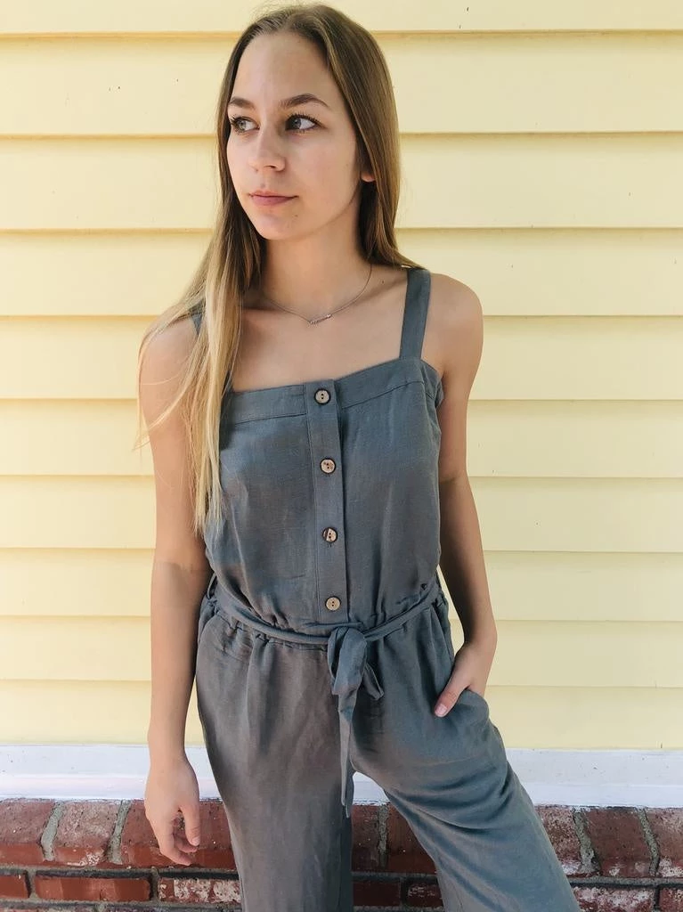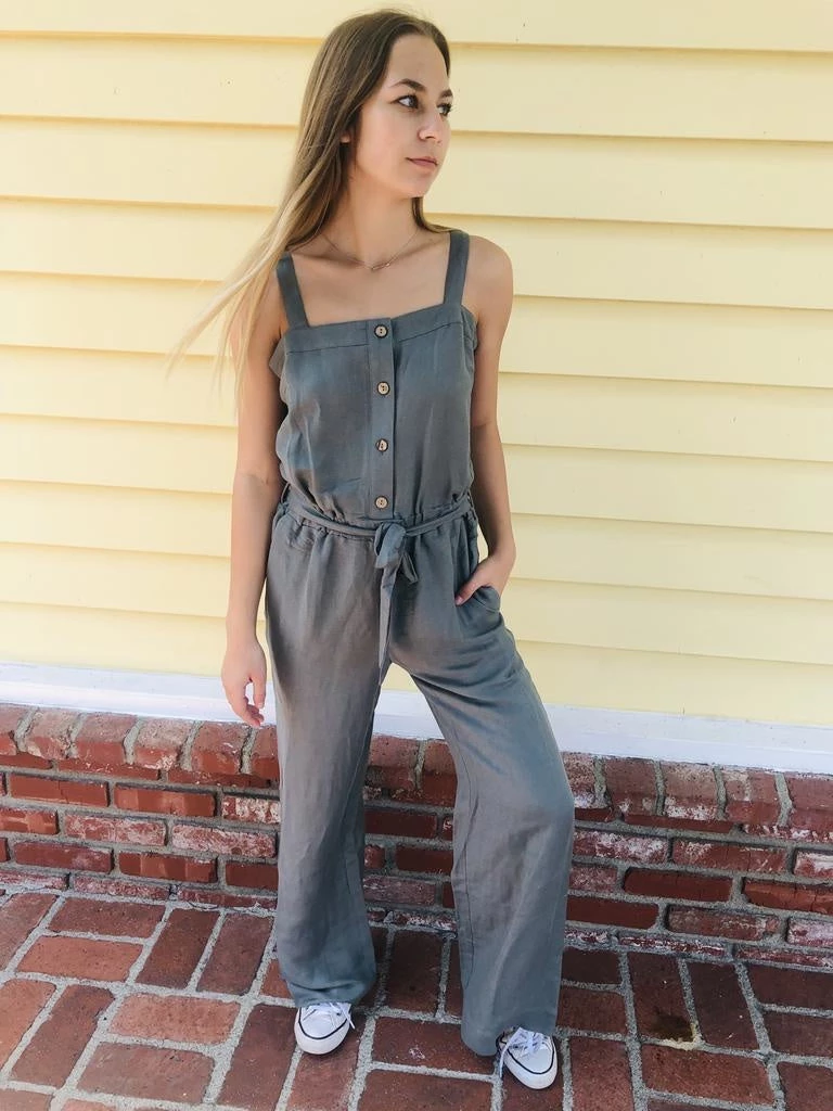 You need this linen wide leg jumpsuit, like yesterday! A classic sage green colorway, this jumpsuit is lightweight and sophisticated. A tie waist jumpsuit with adjustable straps and smocked back. (Model wearing a Small)