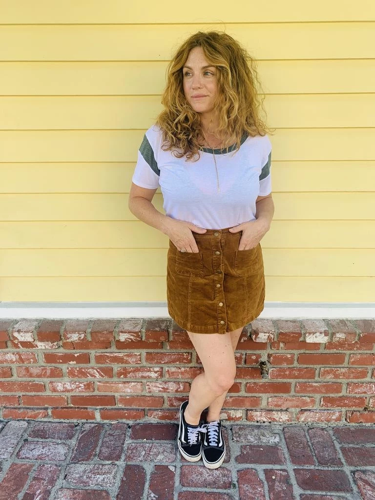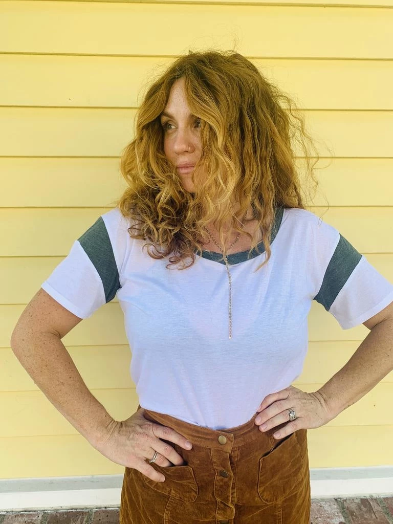 Score some major points with this sporty football tee! And if you’re not the sporty type, that’s cool. At least you’ll look cute in this soft jersey tee with drop shoulder sleeves and shirttail hem. Model wearing size S.