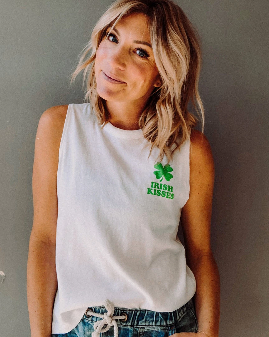 St Pattys Day is a BIG deal in our house. We love the Irish Kisses muscle Tee with the cutest lucky little details for one of our favorite holidays. A more structured fitting tank, size up for a looser fit!!!