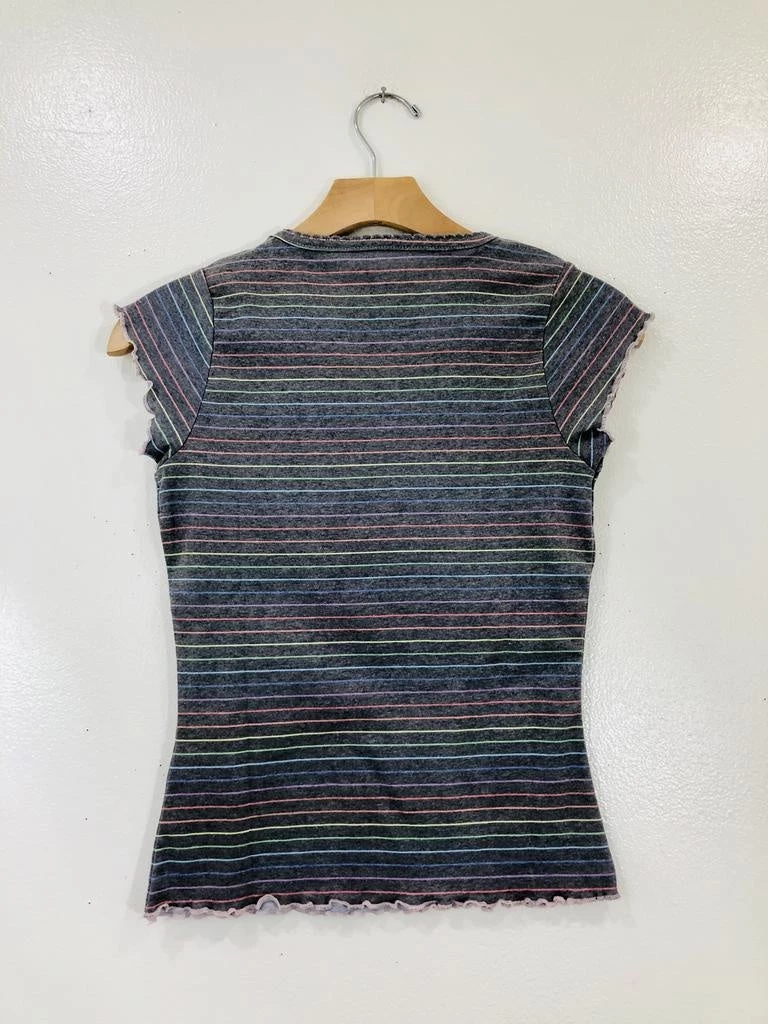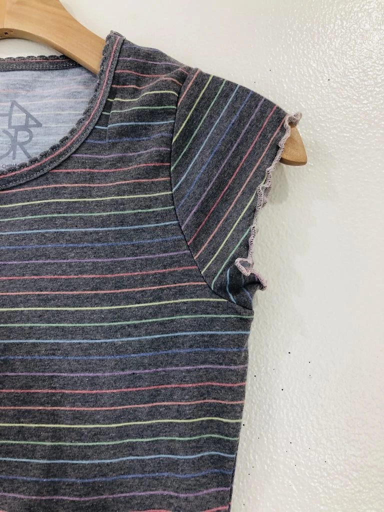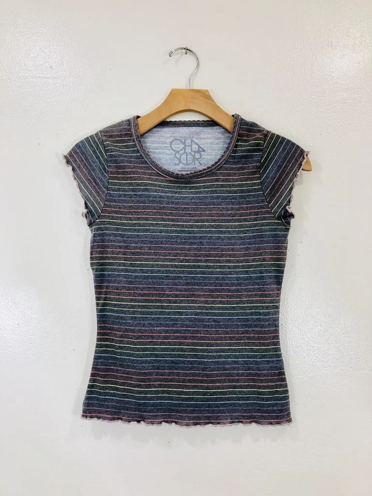 This form fitting tee hugs in all the right places. Baby tee’s are back! With a crew neck line, dainty cap sleeves, ruffle trim and a fun pattern.