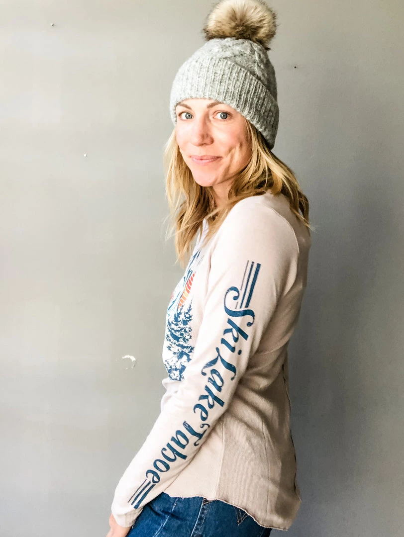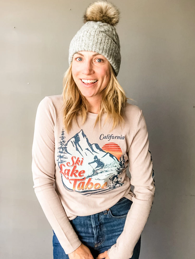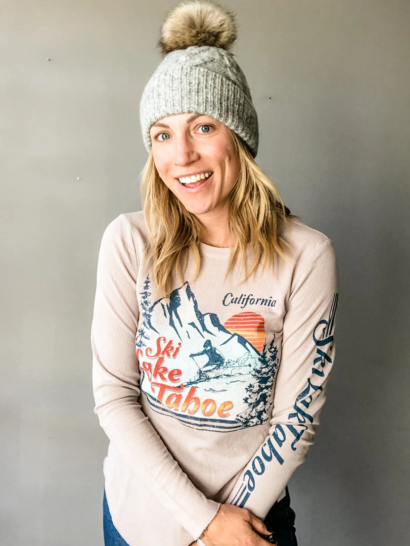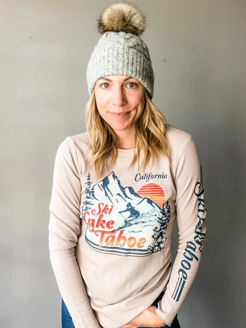 ‘Tis the season babe…for skiing at one of our favorite Calfiornia locales, Lake Tahoe!! This ribbed thermal is a waffle knit long sleeve with crew neck and fitted sleeves. A scooped hemline with “Ski Lake Tahoe” graphic on front and down the left sleeve. A muted colorway that gives us some serious vintage vibes. Cozy on up to this long sleeve!