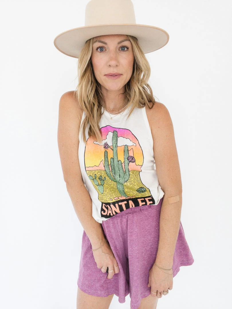 A tip of the hat to the magical place we all know and love, Santa Fe! This off-white tank has a fun, vibrant graphic on the front showing a warm sunset over the desert landscape. It has a racerback and a longer hemline that looks stellar tucked in to a good pair of denim!