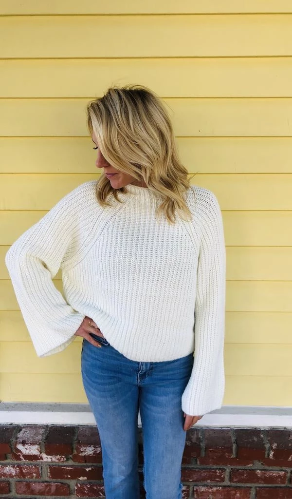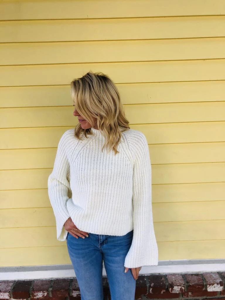 Winter white at its finest. A knit sweater with a slight mock neck, cropped fit and bell sleeves. Perfect with denim and booties for any occasion. Runs true to size.