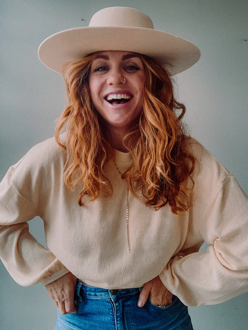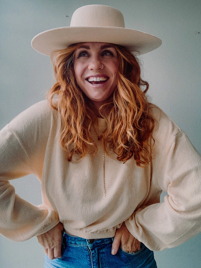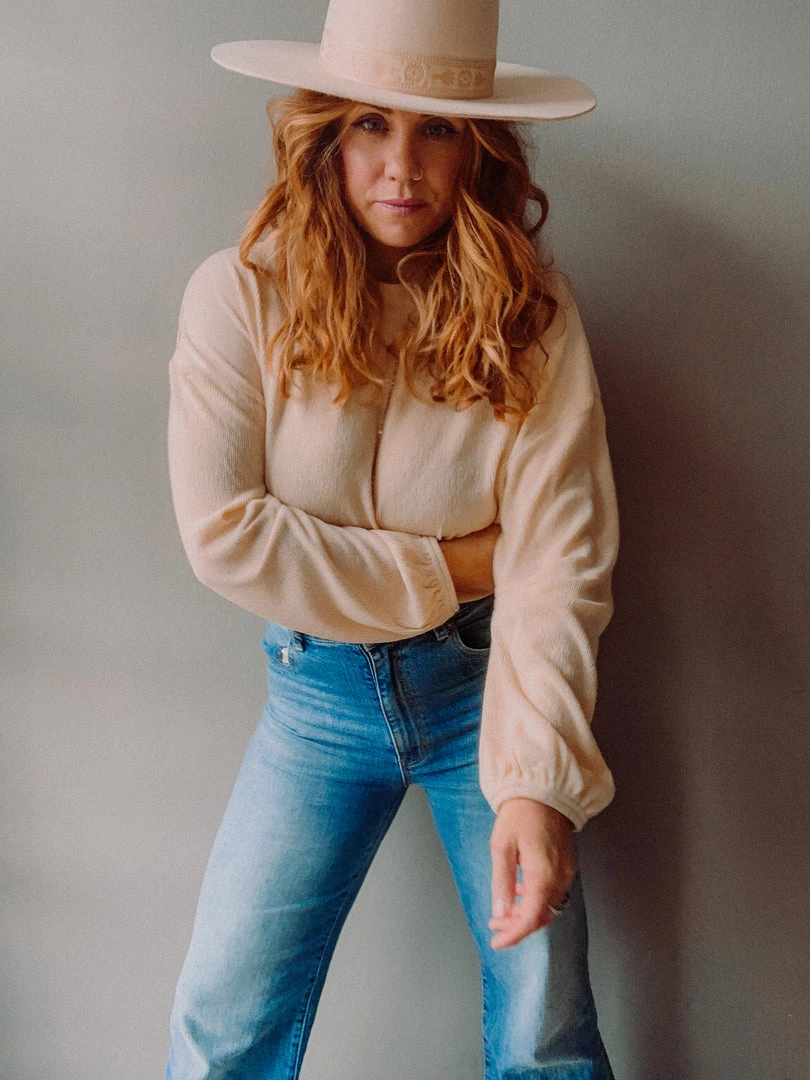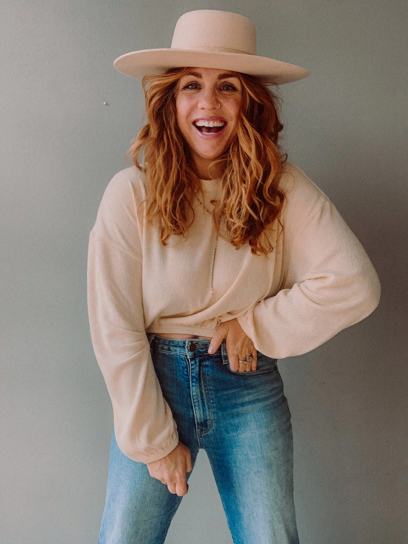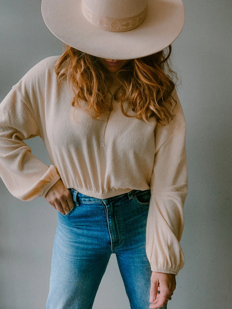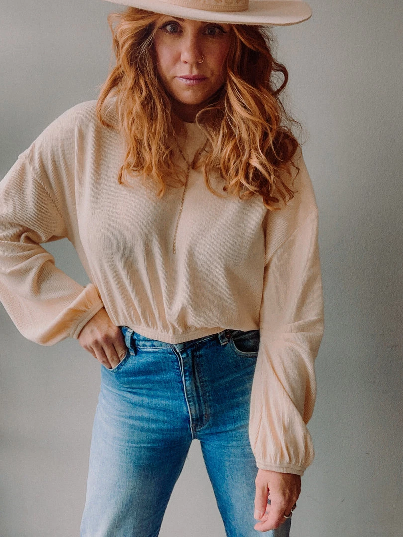 Made with an irresistibly soft fleece, this cropped crewneck pullover has a cropped but super blousy fit, with an elastic waist and loose, balloon-style sleeves. Sooo comfortable and soft! We love this timeless neutral with any and all denim options. And we love a crop that doesn’t show ALL the belly. Becuase I personally don’t need to show ALL my belly. Just the tiniest sliver if you’re lucky.