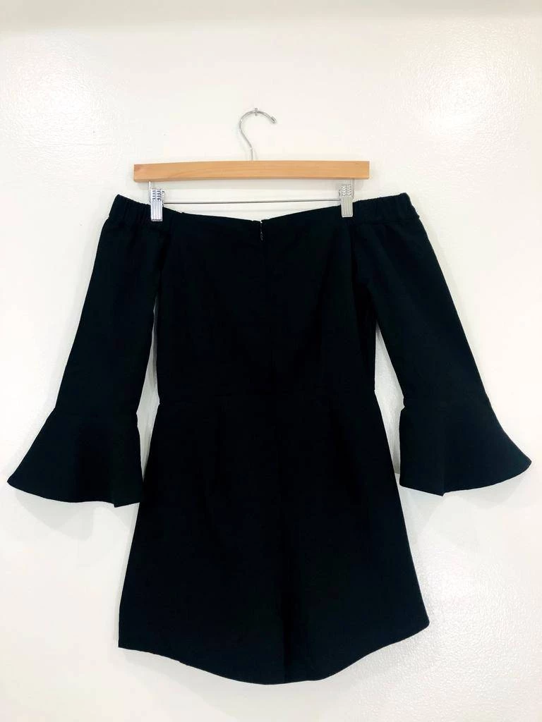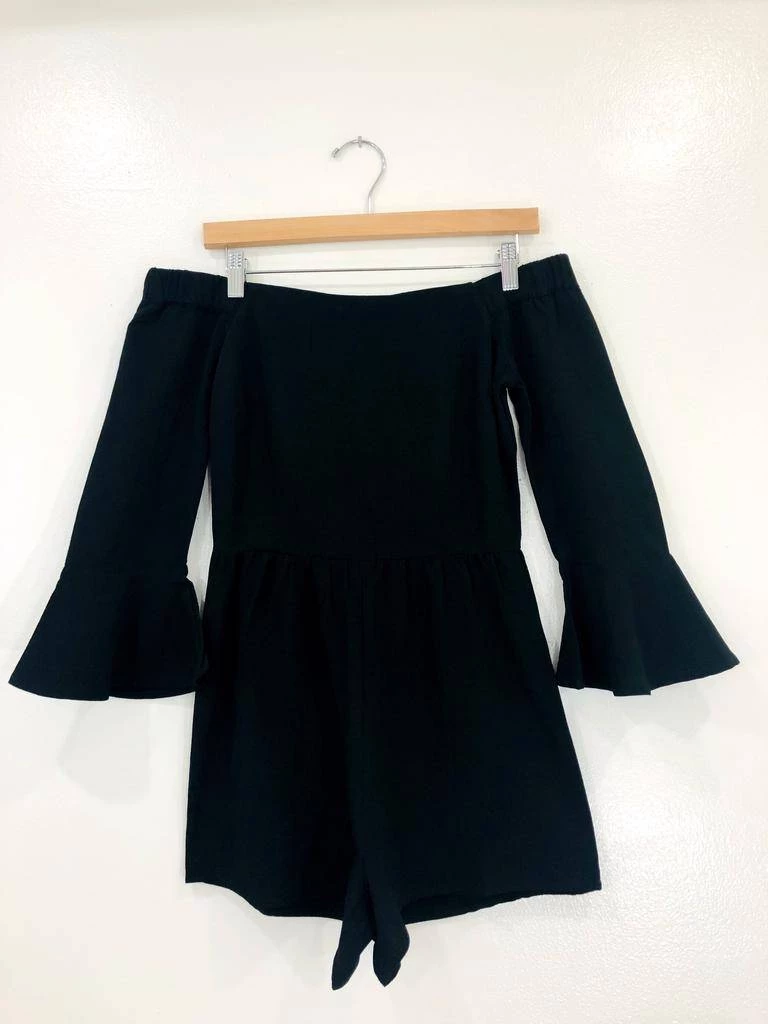 A closet staple you need in your wardrobe, this off the shoulder romper has elastic banded sleeves that’ll stay put on your arms and also features flare sleeve details. This romper fits true to size and has a hidden zipper at the back.