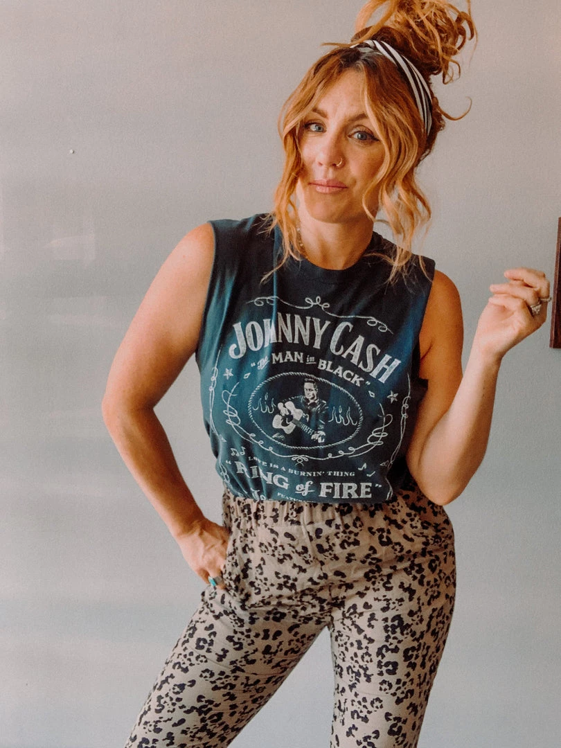 Johnny Cash is known for his iconic hit Ring of Fire and this muscle tee is the perfect little bit of country and a little bit of rock n roll. You can pair this tee with literally anything. We love it with denim or a little funky with leopard. Loose fitting.