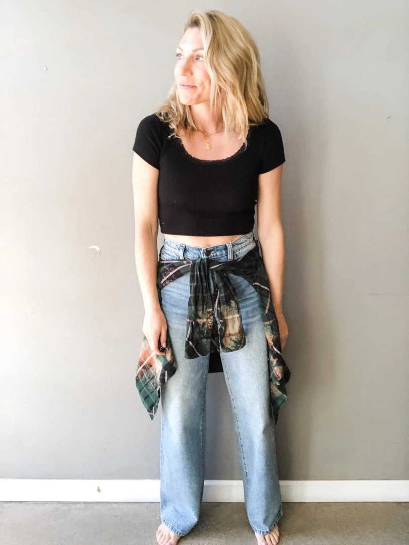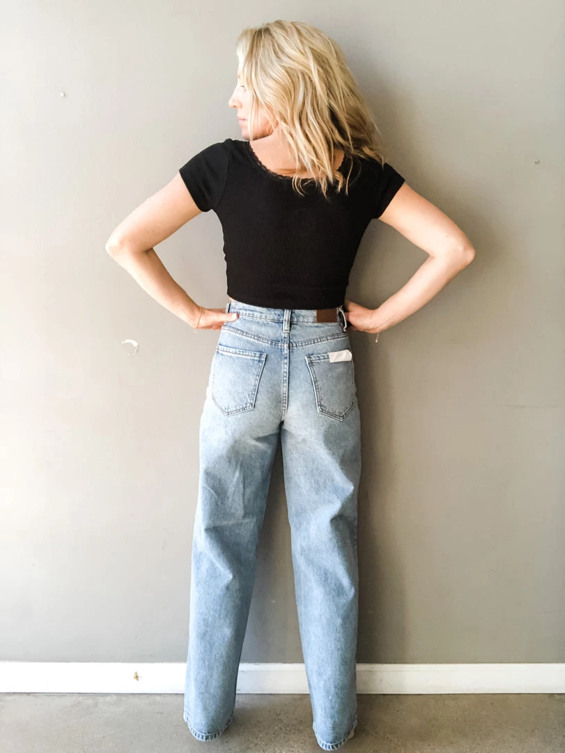 The dad jean is here and we are crushing on it. A high rise fit with slouchy, loose fitting straight legs. Fitted at the waist while still giving that booty a little recognition with a relaxed fit leg. 100% cotton denim in a medium wash with 5 pockets and zipper fly with button closure.