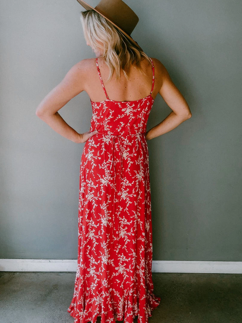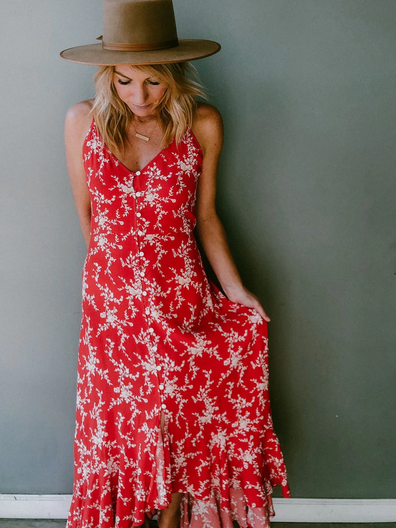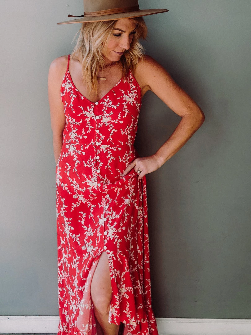 The vibrant Oasis Maxi features a slimming and elegant shape. A striking print with attached tie waist and adjustable straps. This maxi runs true to size and features a V neckline with button down front. This silhouette is a cult favorite.